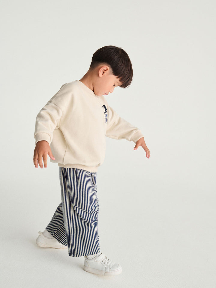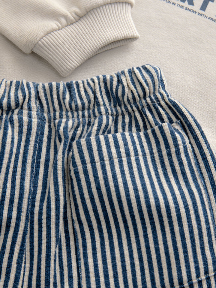 Our sweatshirt and stripes joggers set was made for having effortless styling. This two-piece set is made from breathable cotton and features a black sweatshirt and stripey printed joggers. Perfect for his outdoor adventures, add this to his rotation for a seamlessly stylish look. Two piece set 100% Cotton Sweatshirt with a smiley face Elasticated joggers Pockets Machine washable. Sweater 93% Cotton, 7% Recycled polyester. Jogger 100% Cotton. Country of Origin: Pakistan
