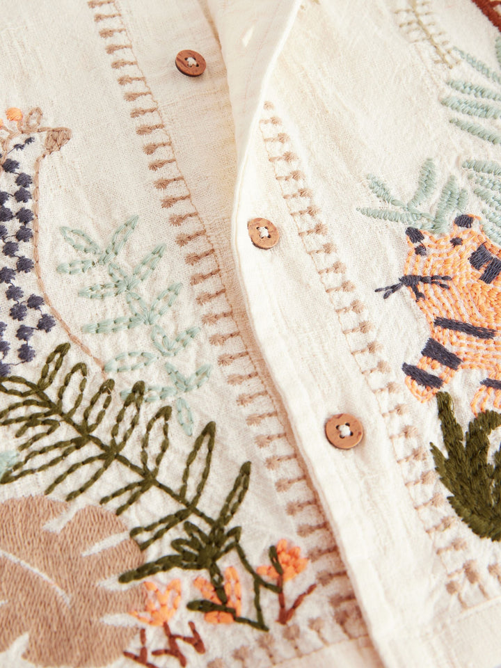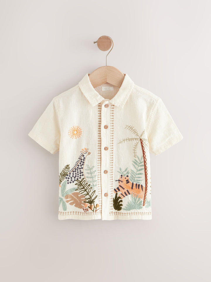Perfect for a summer holiday, this ecru white pure-cotton short sleeve shirt has a button-up fastening, a textured feel and embroidered safari detailing that's both smart looking and fun, finished with a classic collar. 100% cotton Textured fabric Safari embroidered design Button-up fastening Classic collar 100% Cotton. Country of Origin: India