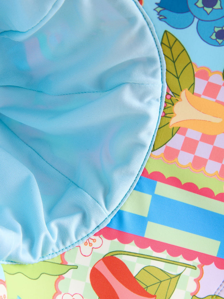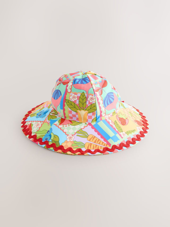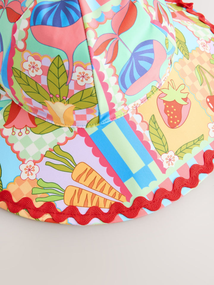 This fruit print swim hat puts the fun in functional. Ideal for protecting your little one's head from the sun, this lightweight swim hat is coated in a vibrant fruit and veg print with ric rac trim detailing. Lightweight fabric Ric-rac trim Fruit print design Wide brim Main 82% Recycled polyester, 18% Elastane. Lining 92% Recycled polyester, 8% Elastane. Country of Origin: China This fabric will provide protection against solar ultraviolet radiation. It has been independently tested and given a UPF rating of 50+ which blocks more than 97.5% of UV rays. Important Advice: • Sun exposure causes skin damage • Only covered areas are protected • Always use a high protection factor sunscreen on any exposed areas of skin • The protection offered by this fabric may be reduced with use or if stretched or wet • Always rinse in fresh water after each use • Young children should be kept in the shade between 11 and 3 • Don't forget your hat and sunglasses. • Fabric provides UVA +UVB protection from the sun.