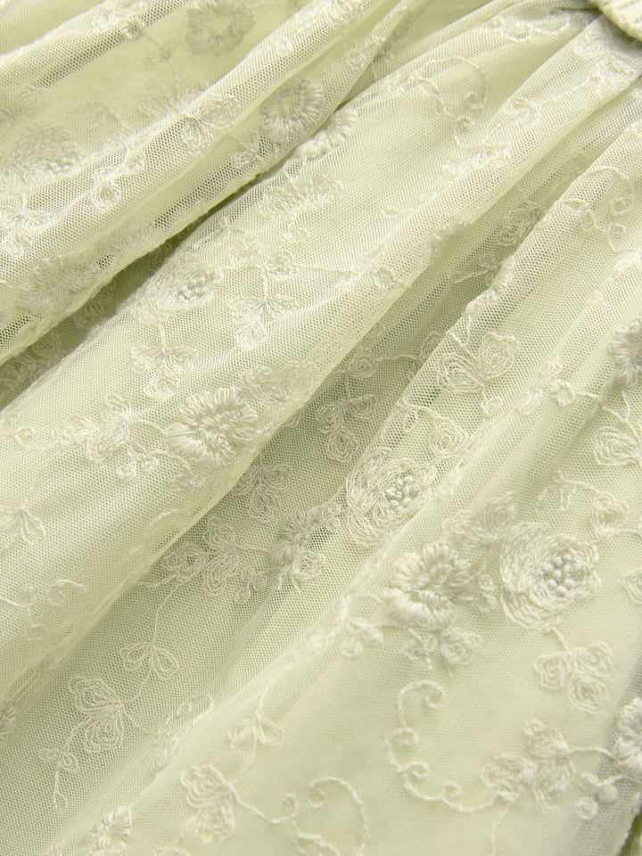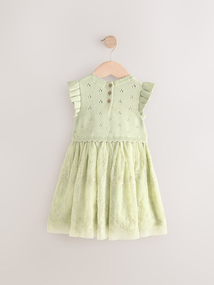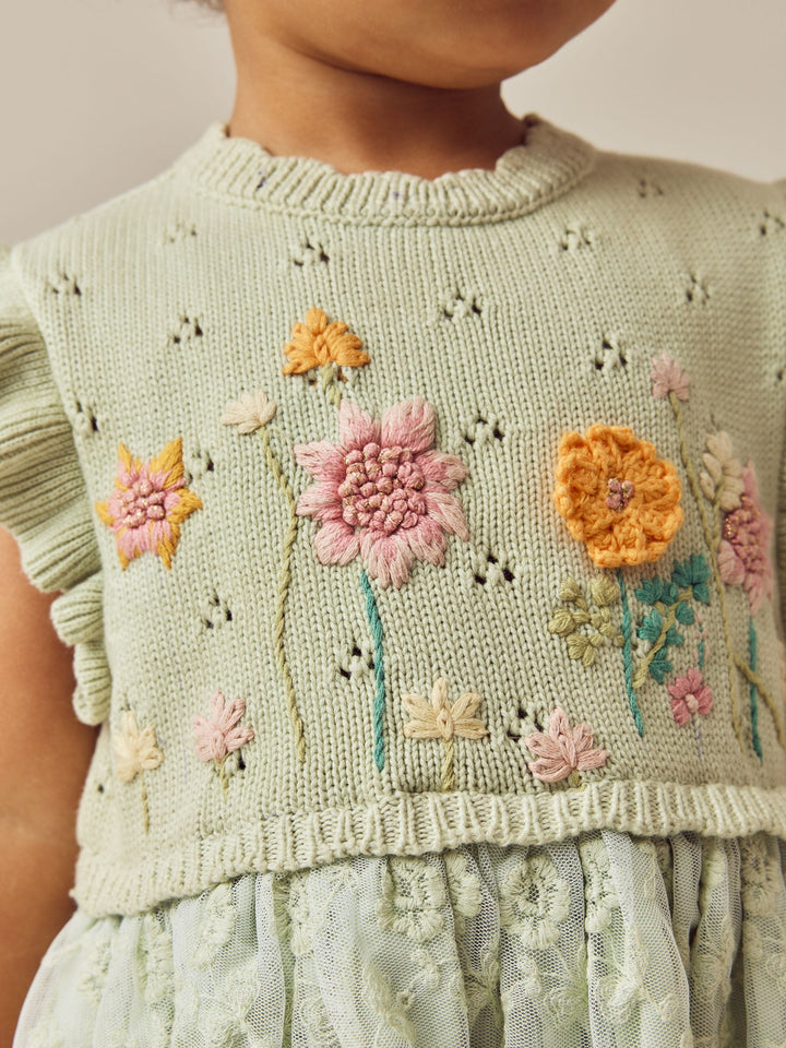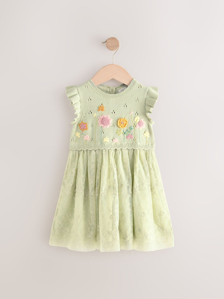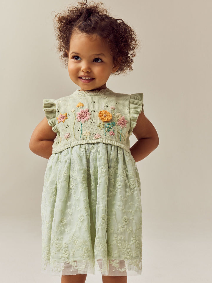 This adorable party dress has a 2-in-1 design, featuring a knitted bodice with floral embroidered detailing, ruffle shoulder detailing and a ruffle collar, finished with a layered mesh skirt that's perfect for twirling. Twofer design Knitted bodice Floral embroidery Ruffle shoulders Layered mesh skirt Main 100% Cotton. Lining 100% Cotton. Mesh 100% Nylon. Country of Origin: India