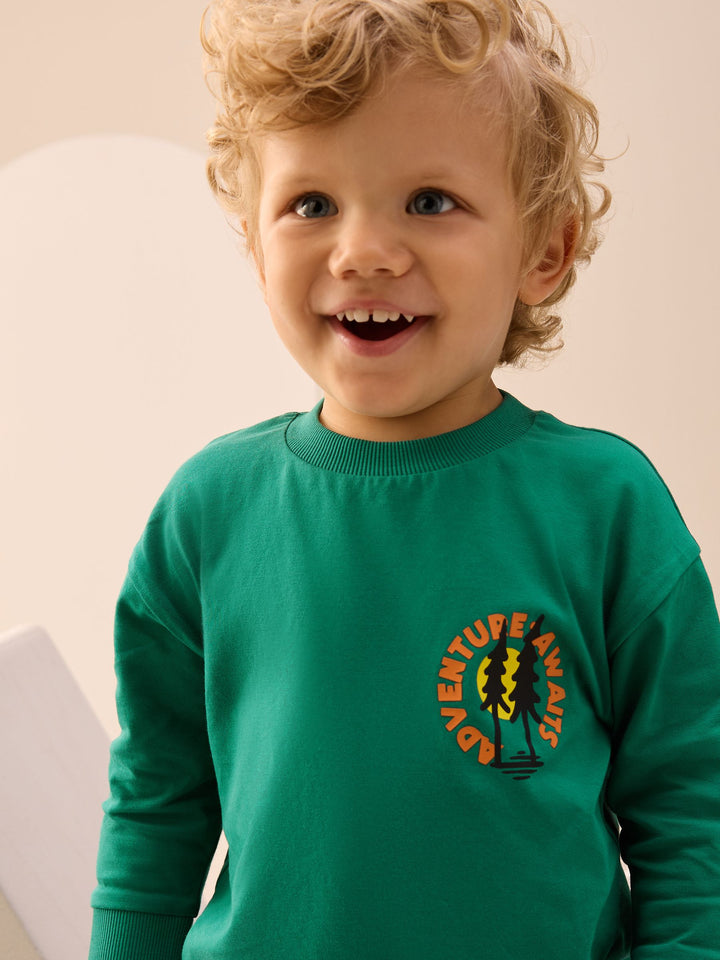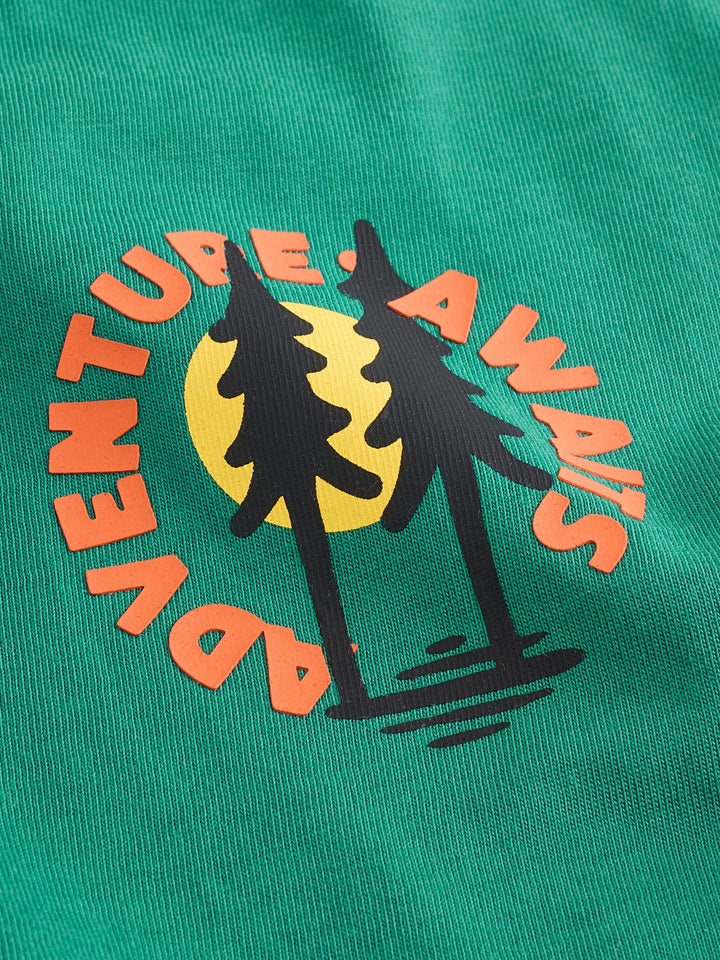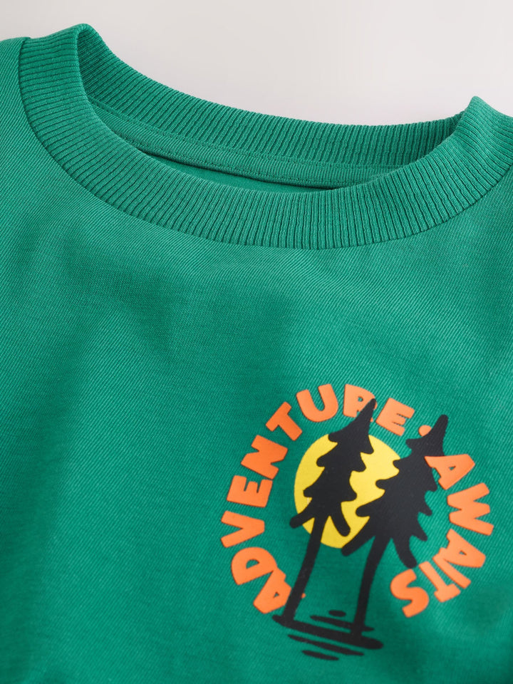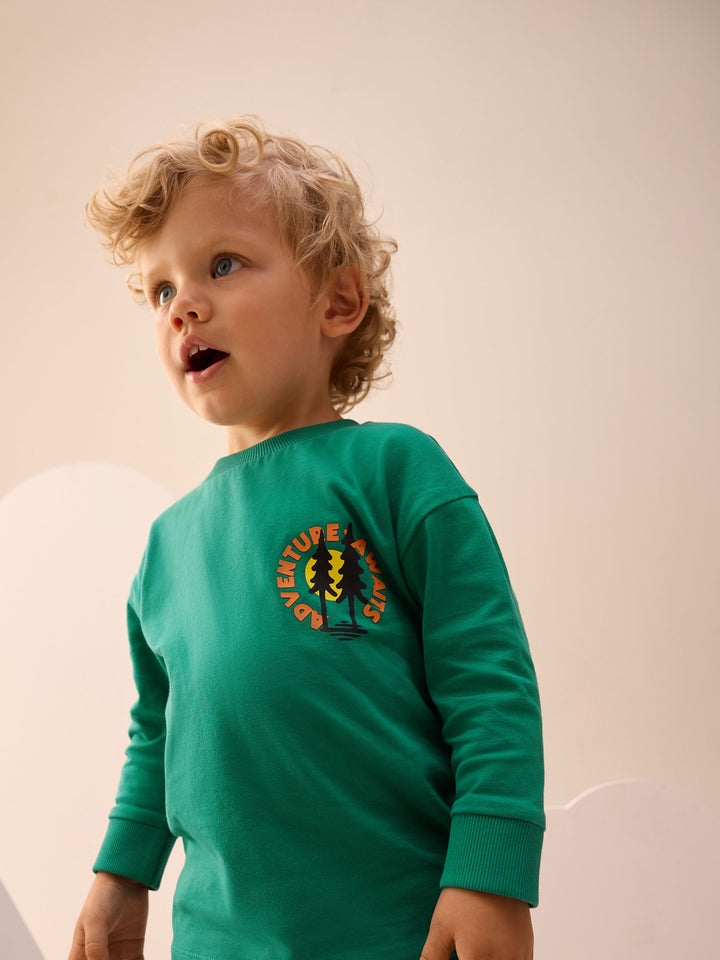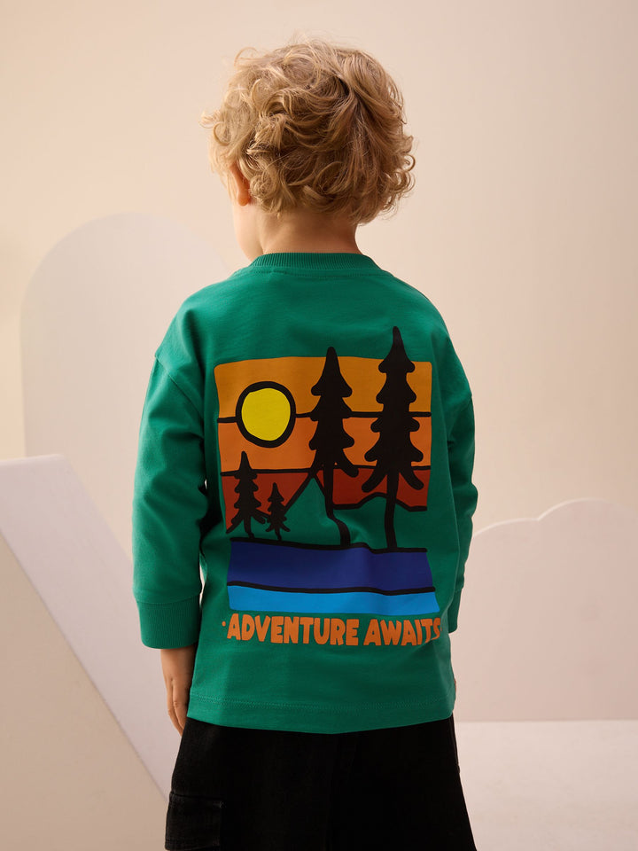 Ready for adventure? This green long-sleeved t-shirt is a fun and comfortable choice for their next day out. Featuring a vibrant scene print on the back and a small emblem on the front, it's a playful top that is perfect for layering. Made from a soft, cotton-blend fabric, it's a practical and stylish addition to their wardrobe. Front and back printed Long sleeves Crew neckline Ribbed cuffs Machine washable. 100% Cotton. Country of Origin: Bangladesh