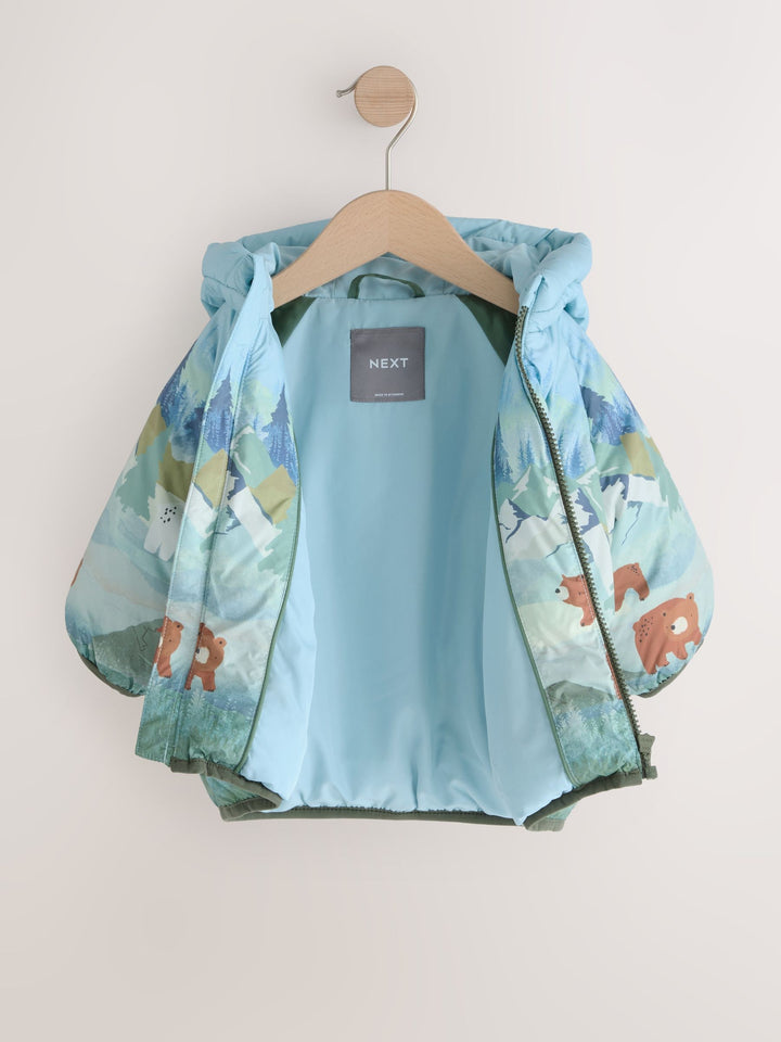 Bundle up your little adventurer in this cosy Green Scene Print Padded Coat. This delightful jacket features a unique, all-over print showcasing a charming bears in the mountains scene in shades of blue and green. Designed for reliable outdoor wear, it is shower resistant and wadded for extra warmth. The coat includes a practical full zip fastening, a cosy hood for maximum coverage, and convenient side pockets for small treasures. Shower resistant Side pockets Wadded for extra warmth Machine washable. Main 100% Recycled polyester. Lining 100% Recycled polyester. Wadding 100% Recycled polyester. Country of Origin: Myanmar