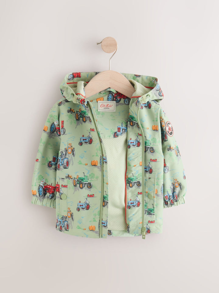 Cute, lightweight and shower resistant, this jacket features an all-over tractor print with a zip fastening, side pockets and an adjustable hood. A tractor all-over print decorates the jacket, whilst a a mesh lining keeps things breathable. Shower resistant Zip fastening Mesh lining Side pockets Adjustable hood Machine washable. Main 100% Recycled polyester. Lining 100% Recycled polyester. Country of Origin: Bangladesh