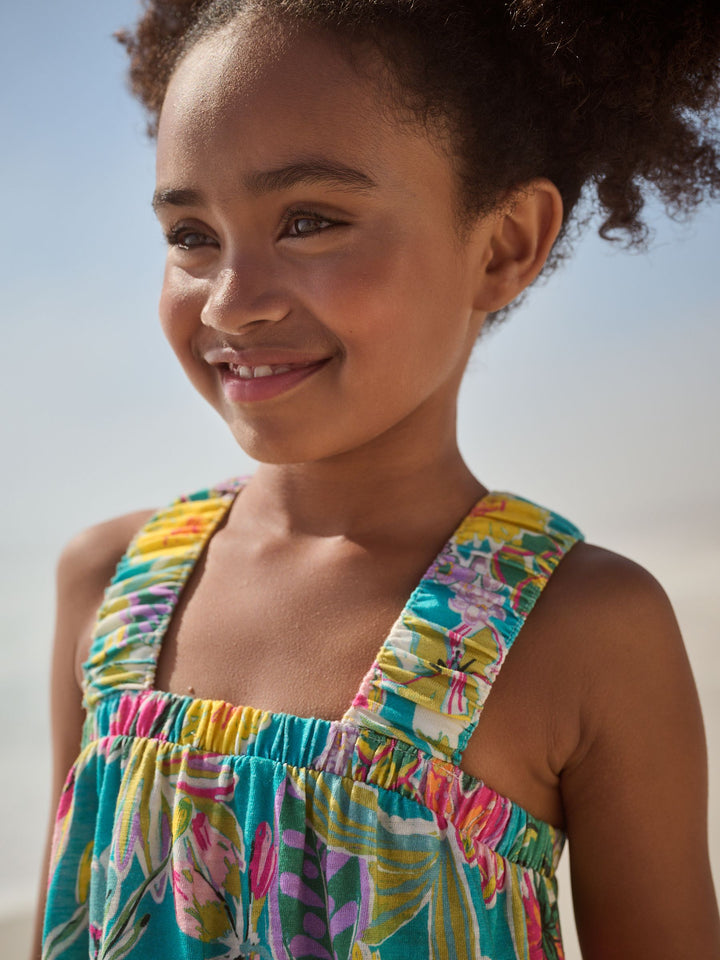 Our ruched strap sundress makes a pretty addition to her warm weather adventures. Made from pure cotton, this flowy dress is coated in a fun print and complete with elasticated straps for easy dressing. 100% cotton Ruched detailing Elasticated straps 100% Cotton. Country of Origin: Sri Lanka