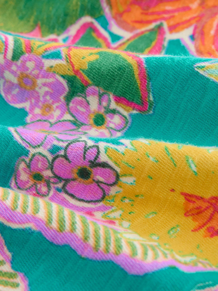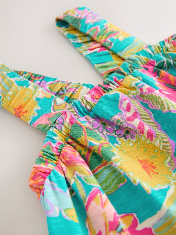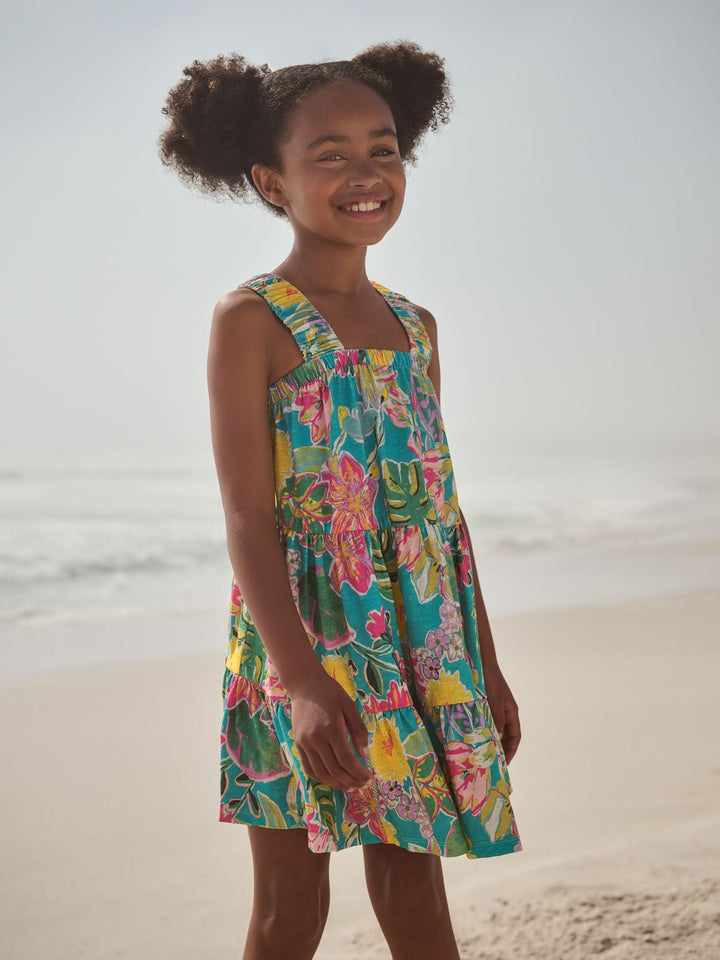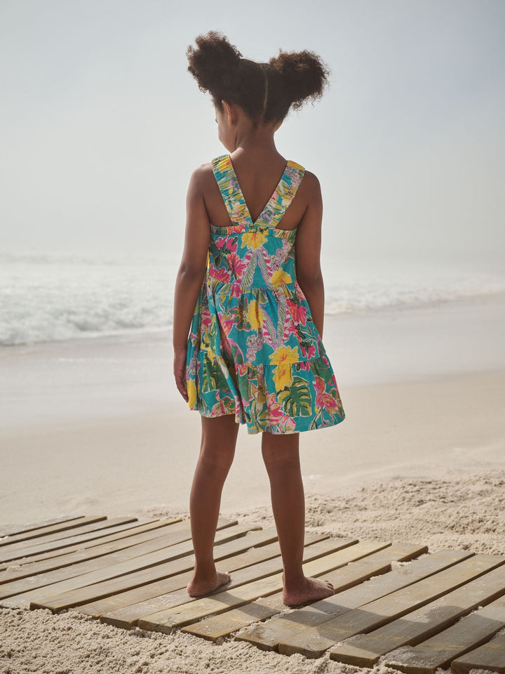 Green Tropical Print 100% Cotton Ruched Strap Sundress (3-16yrs)