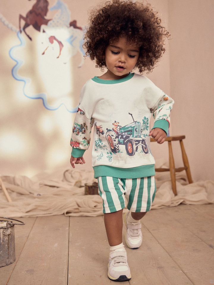 This Cath Kidston long sleeve sweatshirt and stripe shorts set makes a wonderful addition to his collection. Coated in a vintage 50's inspired tractor print with furry friends from our farmyard print, this pure cotton set is ideal for his summer adventures. 2 piece set 100% cotton Long sleeve sweatshirt Elasticated shorts Machine washable. Jumper and Jogger 100% Cotton. Country of Origin: Bangladesh