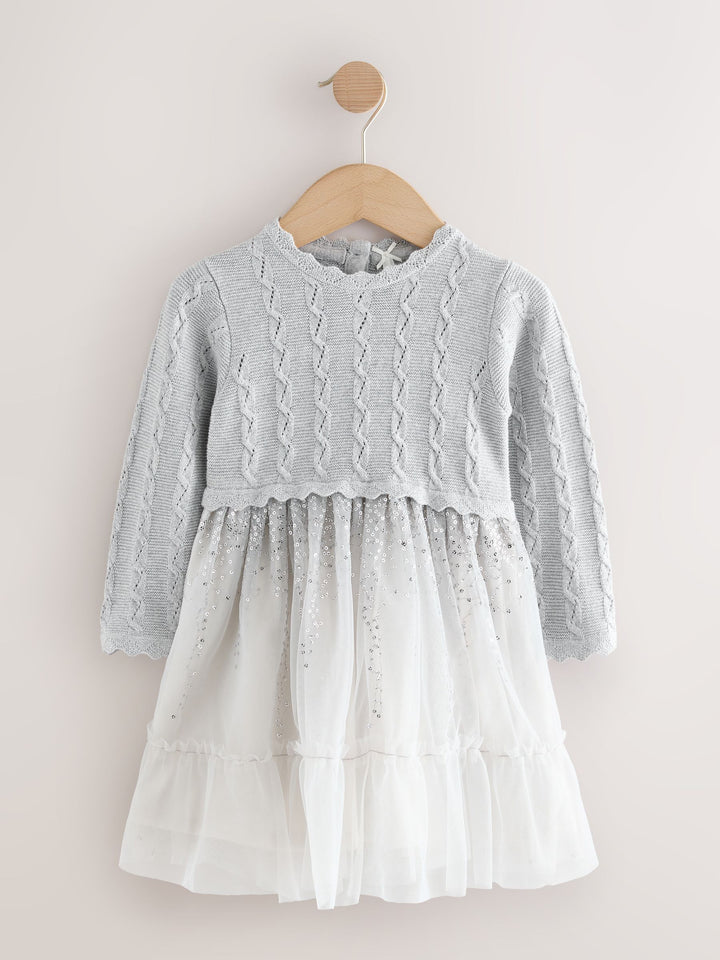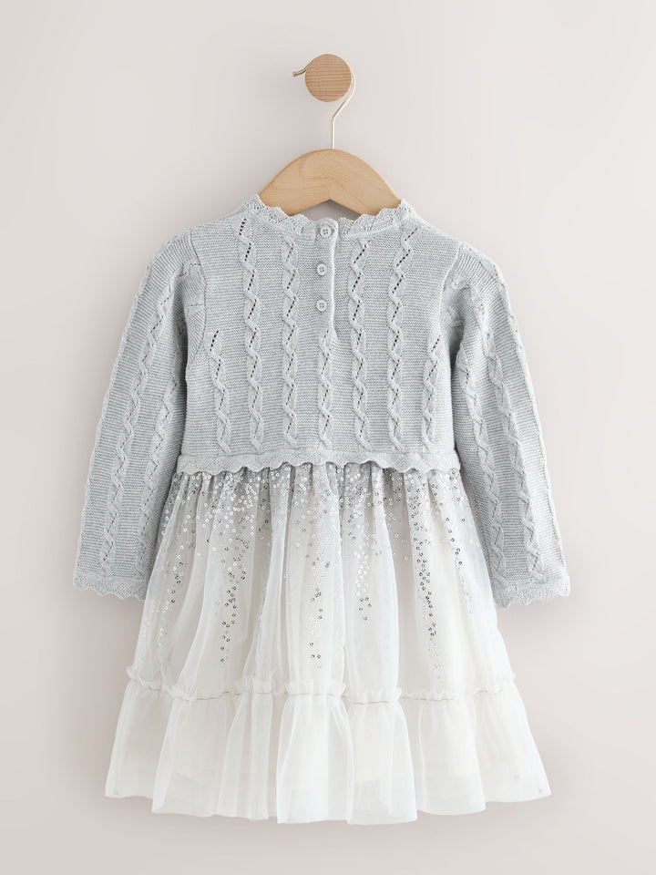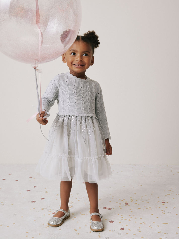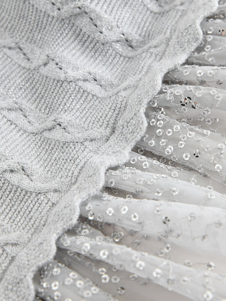 This dress is perfect for a party, holiday event, or any special occasion. The bodice is a soft light grey knit with a decorative texture, showcasing a repeated pattern of vertical cable. It has long sleeves and a simple crew neck. The skirt is high-waisted and voluminous, made of multiple layers of tulle. The upper layer of the skirt is a silvery colour and is dusted with shimmering silver sequin, adding sparkle and movement. The lower layer is pale grey tulle, creating a tiered, floaty look. Body 89% Cotton, 6% Metallised fibre, 5% Polyester. Skirt 100% Nylon. Lining 100% Cotton. Country of Origin: India