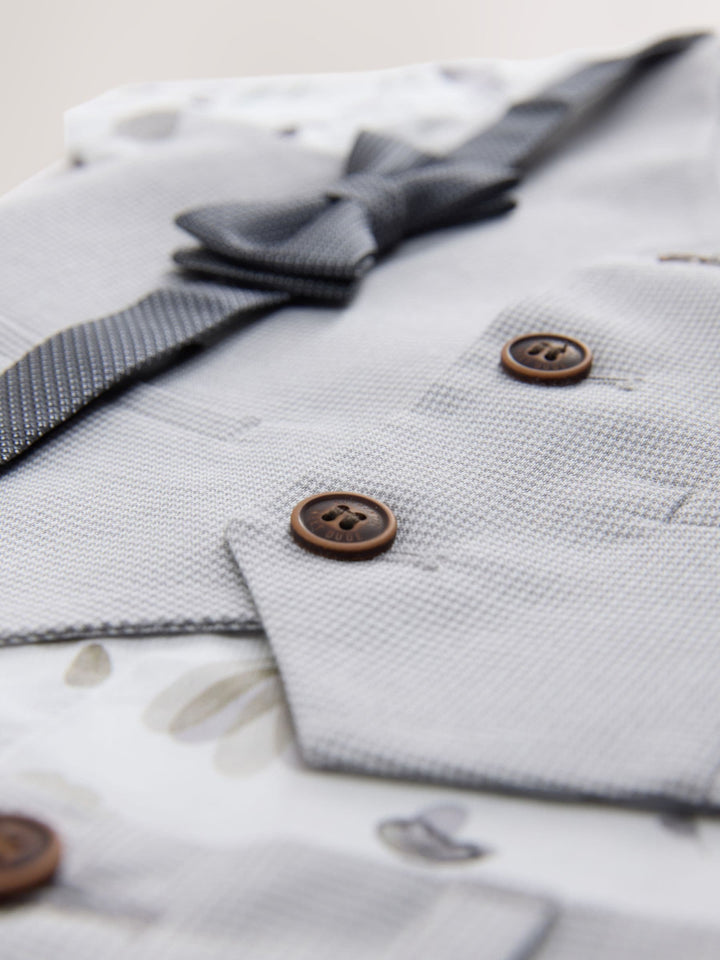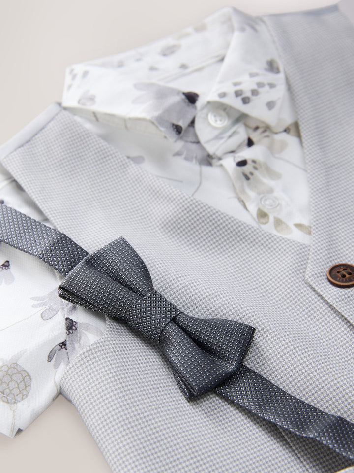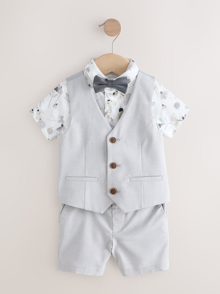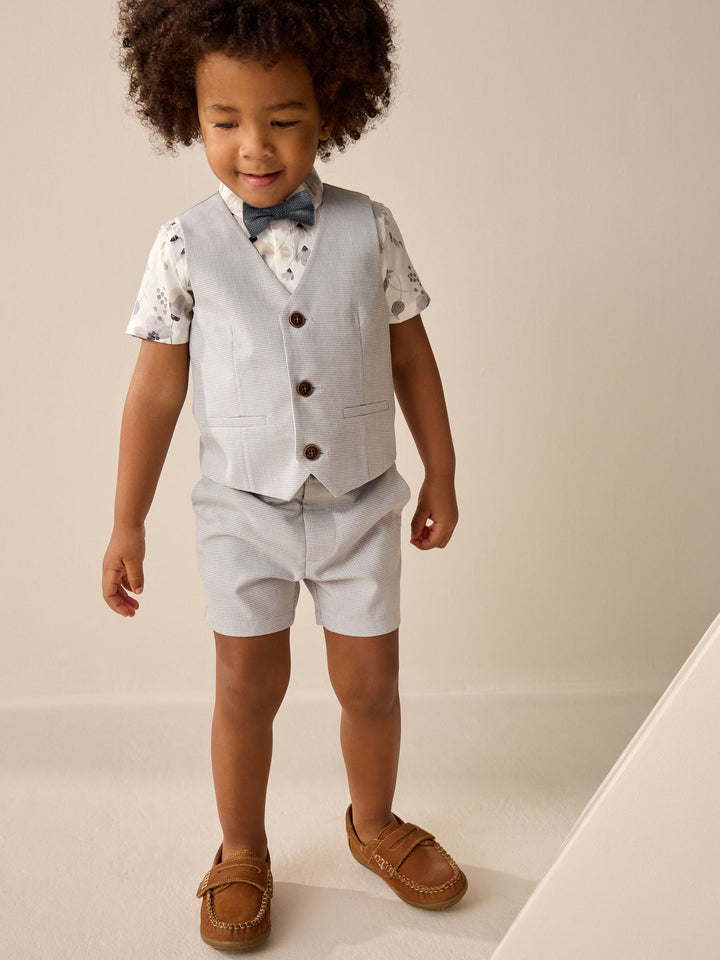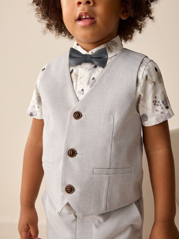 Perfect for special occasions or weddings, this grey puppytooth 4-piece set will have him looking suave all day long. Featuring a short sleeve shirt with an all-over floral print and a button-down fastening, alongside a pair of formal shorts. A grey waistcoat ties the look together with trimmed pockets and button fastening, finished with a touch-fastened bowtie. 4-piece set Short sleeve shirt Button-down All-over print Touch-fastened bow tie Grey waistcoat Textured shorts Waistcoat Main 64% Polyester, 34% Viscose, 2% Elastane. Lining 100% Polyester. Shirt 100% Cotton. Shorts 64% Polyester, 34% Viscose, 2% Elastane. Bow Tie 100% Polyester. Country of Origin: Cambodia