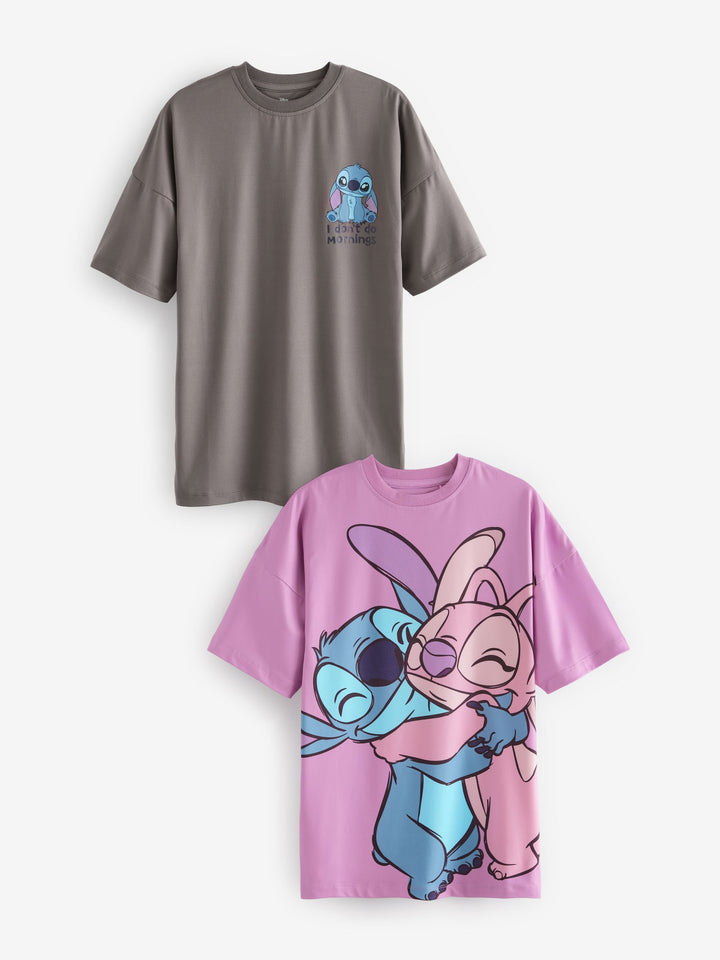 Perfect for Disney fans, this 2-pack of comfortable nighties are perfect for bedtime, featuring licensed Lilo & Stitch graphics in a boxy shape, finished with a crewneck collar. 2-pack Longline, boxy shape Licensed Lilo & Stitch graphics Boxy shape Crewneck collar Machine washable. 2 x Nightdress 95% Recycled polyester, 5% Elastane. Country of Origin: China Warning: Keep away from fire and flames.