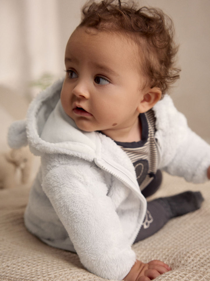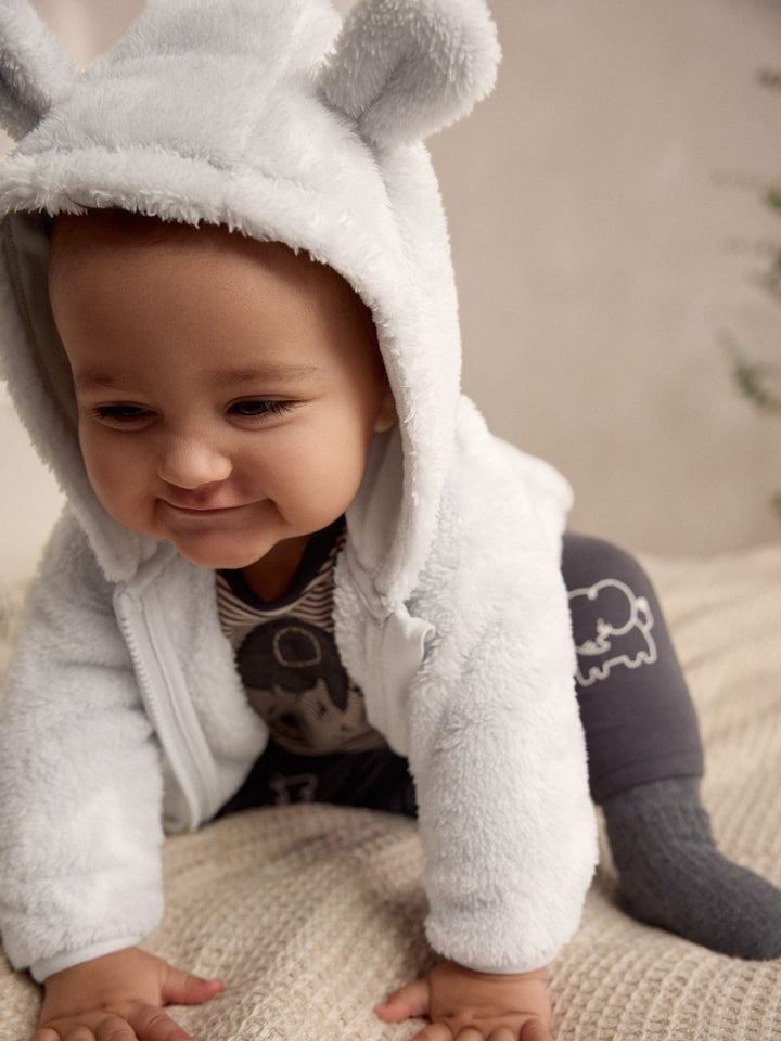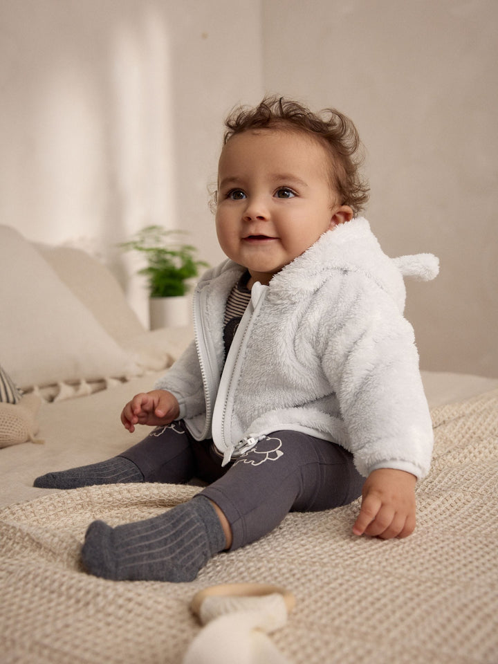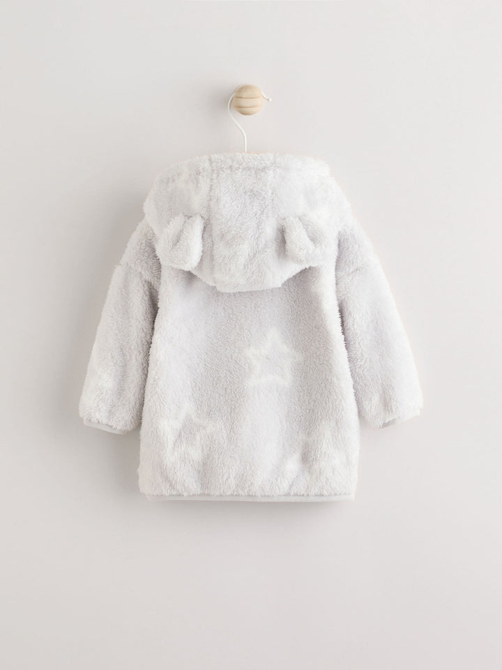 This ultra-cosy grey jacket is made from warm and soft fleece fabric, with adorable 3D ear detailing to the hood, a zip fastening for easy dressing, a warm lining and piped trims. Soft fleece fabric 3D ears to the hood Zip fastening Warm lining Main 100% Recycled polyester. Hood Lining 100% Recycled polyester. Country of Origin: China Warning: Keep away from fire and flames.