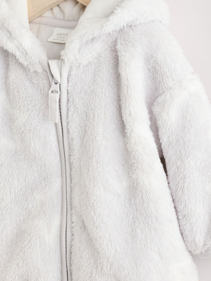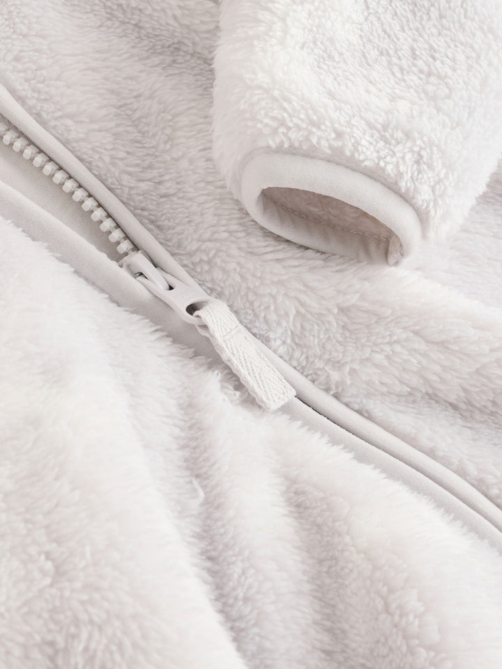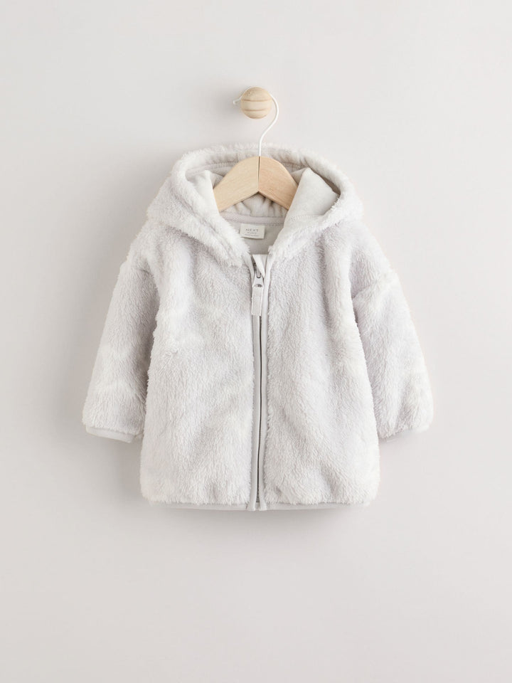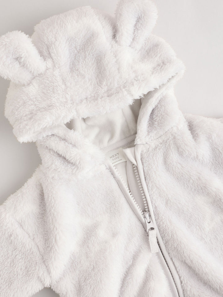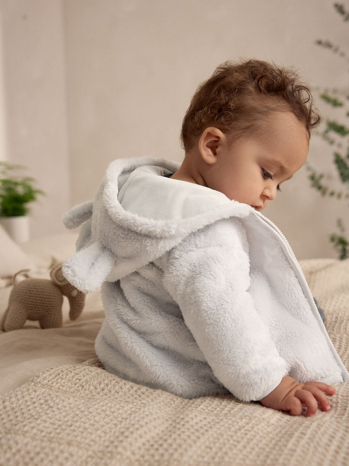 This ultra-cosy grey jacket is made from warm and soft fleece fabric, with adorable 3D ear detailing to the hood, a zip fastening for easy dressing, a warm lining and piped trims. Soft fleece fabric 3D ears to the hood Zip fastening Warm lining Main 100% Recycled polyester. Hood Lining 100% Recycled polyester. Country of Origin: China Warning: Keep away from fire and flames.