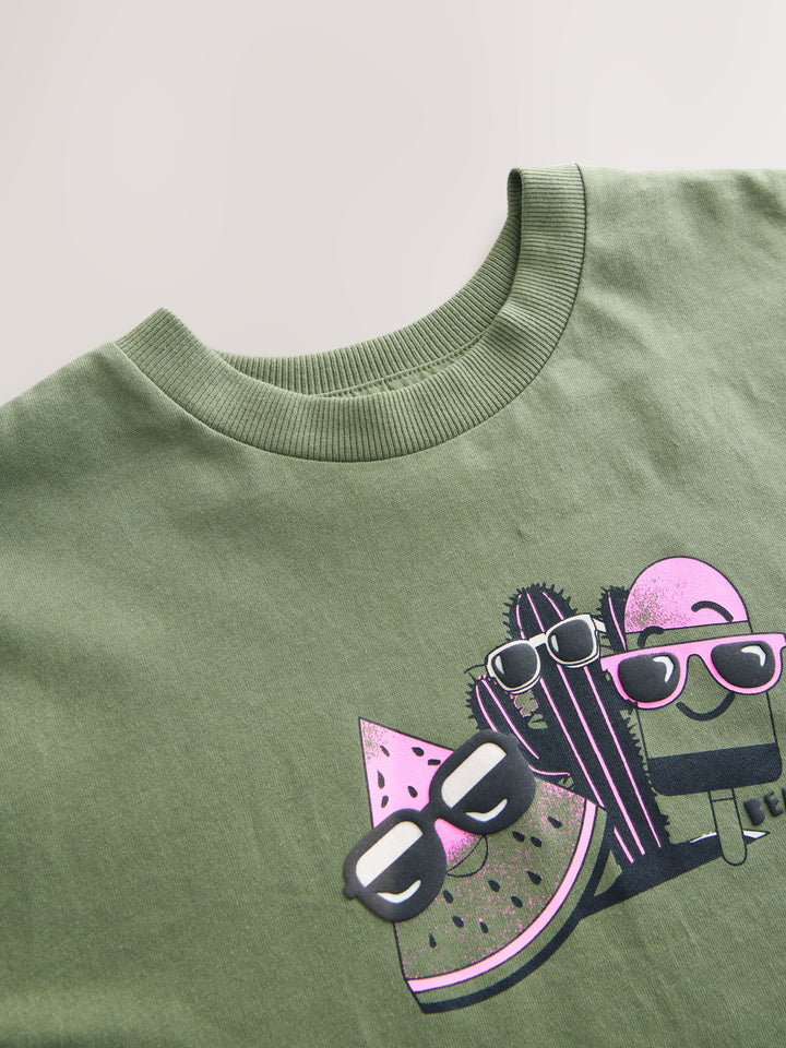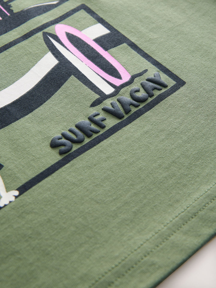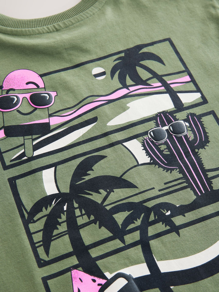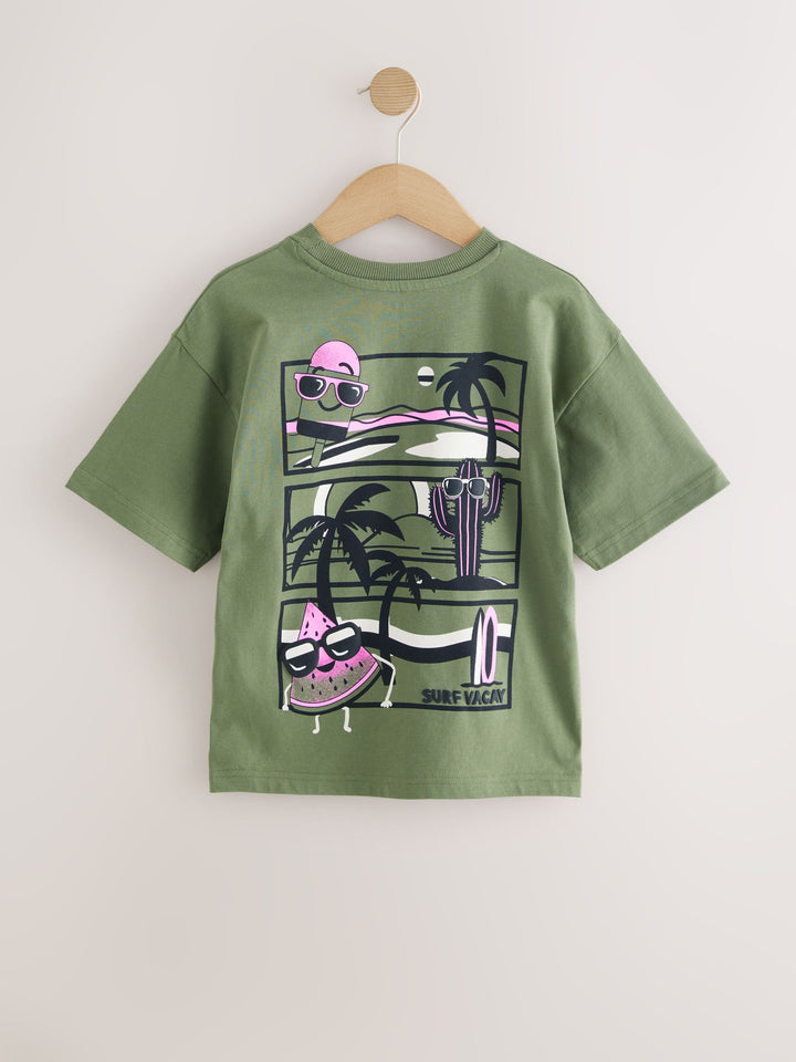 Add to their cool kid style with our relaxed fit khaki green beach-themed front and back print short sleeve t-shirt. With an eye-catching design and comfortable relaxed fit, they'll look as cool as they feel. 100% cotton Graphic print t-shirt Relaxed fit Short sleeves Comfortable fabric Machine washable. 100% Cotton. Country of Origin: India