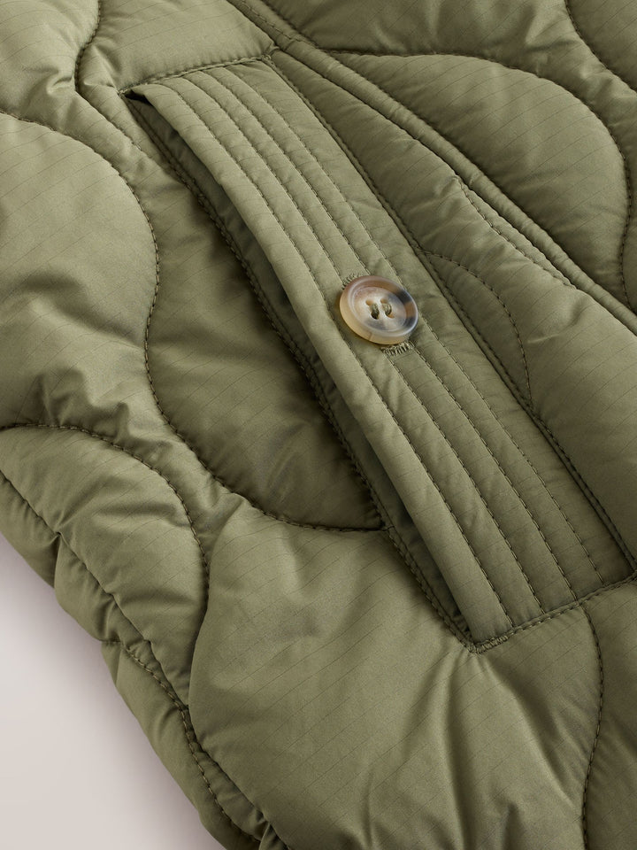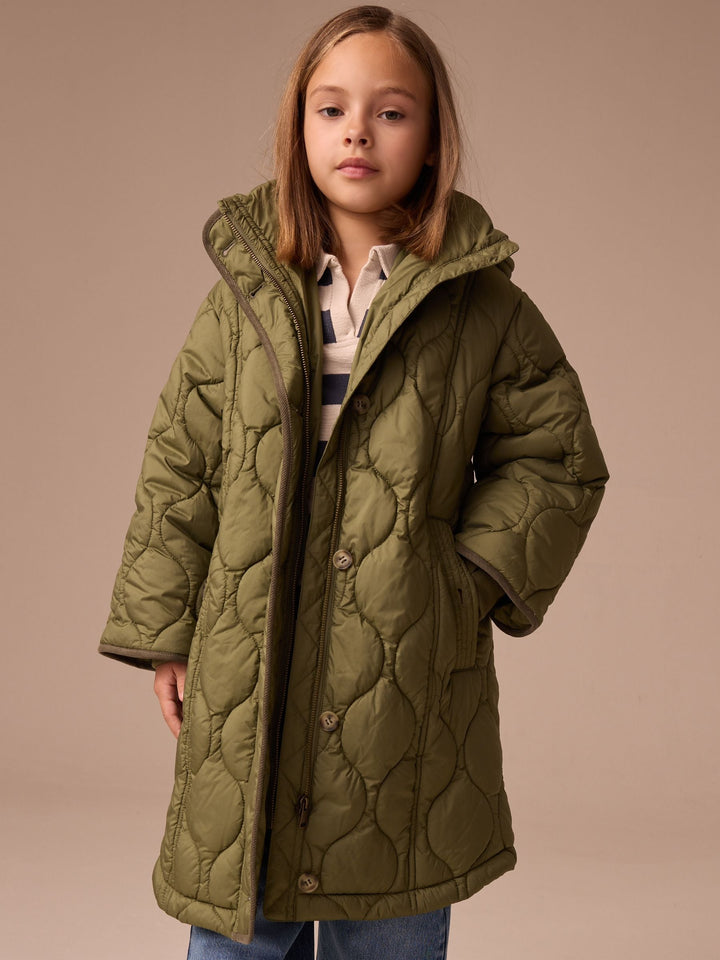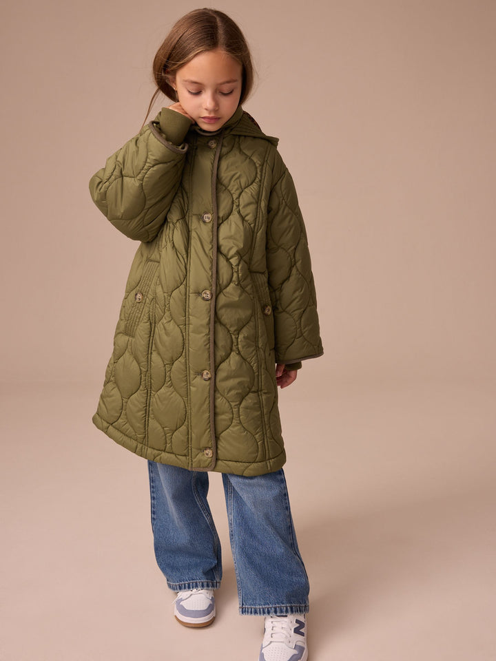 A stylish and practical choice for her next adventure, this shower resistant quilted coat in khaki is designed for both comfort and fun. The fully lined inner provides ultimate warmth, while the quilted design adds a charming touch to her look. Shower resistant Quilted Fully lined Machine washable. Main 100% Recycled polyester. Lining 100% Recycled polyester. Wadding 100% Recycled polyester. Country of Origin: China