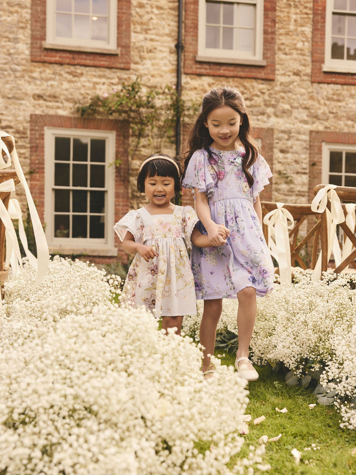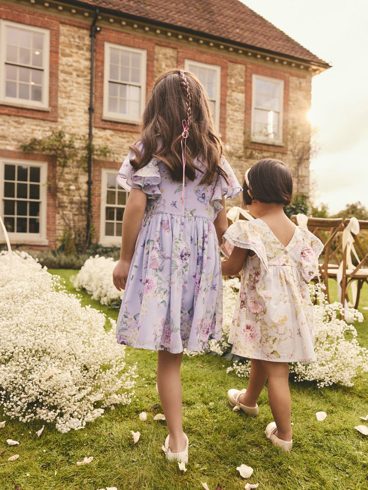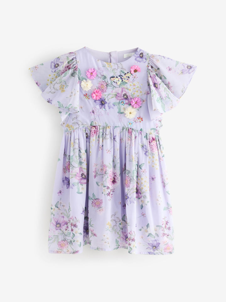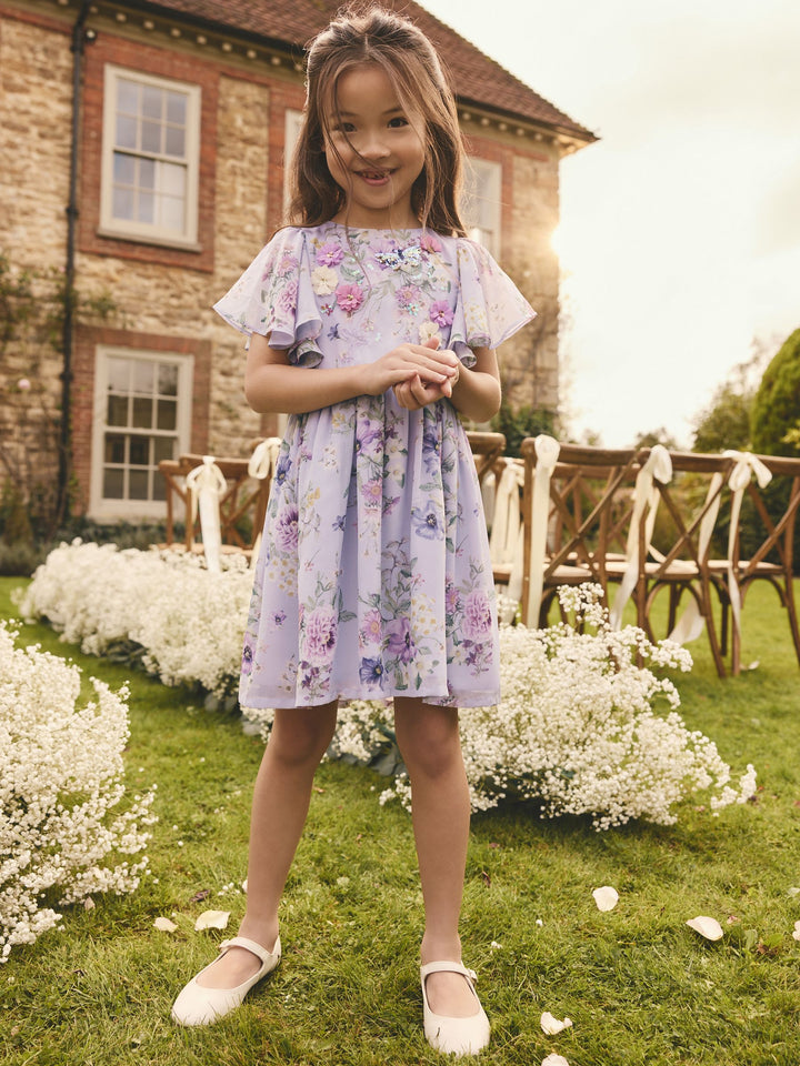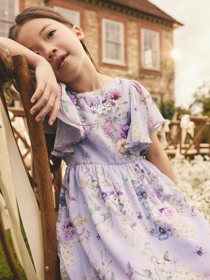 She'll feel like a princess in this gorgeous purple angel sleeve dress, featuring chiffon fabric with delicate embroidery, sequin detailing and ruffle short sleeves, finished with a zip fastening to the back. Regular fit Chiffon fabric Embroidery Sequin detailing Zip fastening to the back Main 100% Recycled polyester. Lining 100% Recycled polyester. Country of Origin: India
