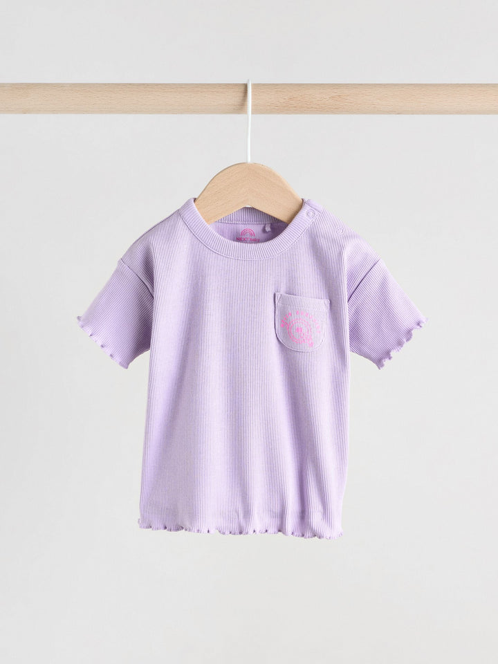 This 2-piece set features a short sleeve t-shirt with a popper fastening to the shoulder, a chest pocket with printed detailing and a ruffle hem, alongside a pair of full-length leggings with an elasticated waistband, finished in a ribbed cotton-rich fabric. 2-piece set Ribbed, cotton-rich fabric Short sleeve t-shirt Printed chest pocket Ruffle trim Full-length leggings Machine washable. T-shirt and Leggings 94% Cotton, 6% Elastane. Country of Origin: India Warning: Keep away from fire and flames.