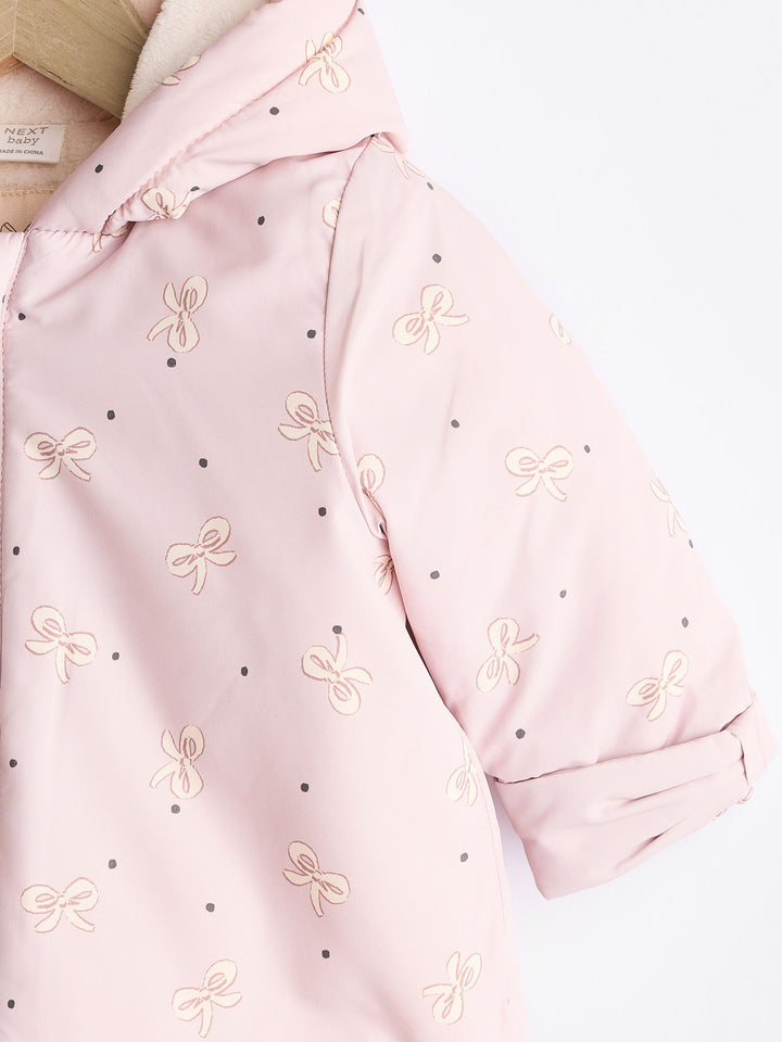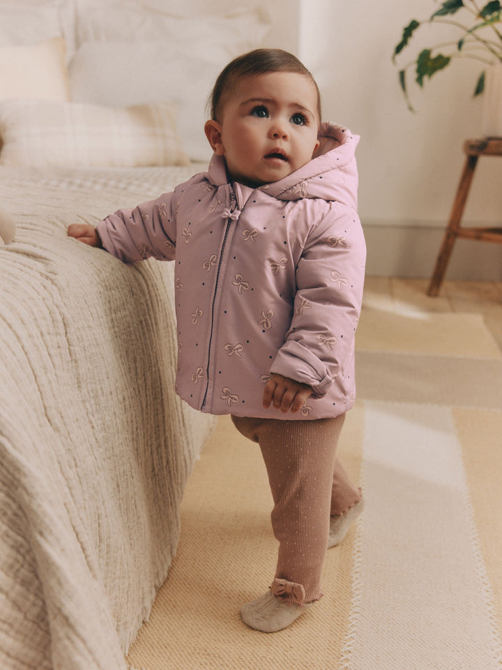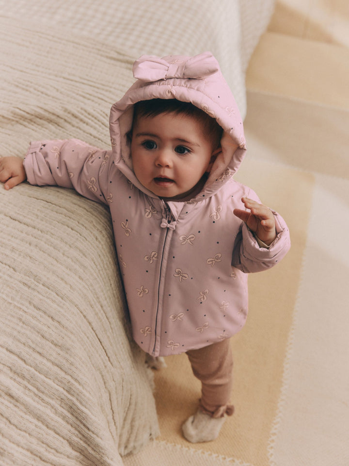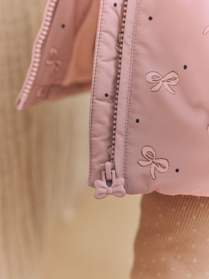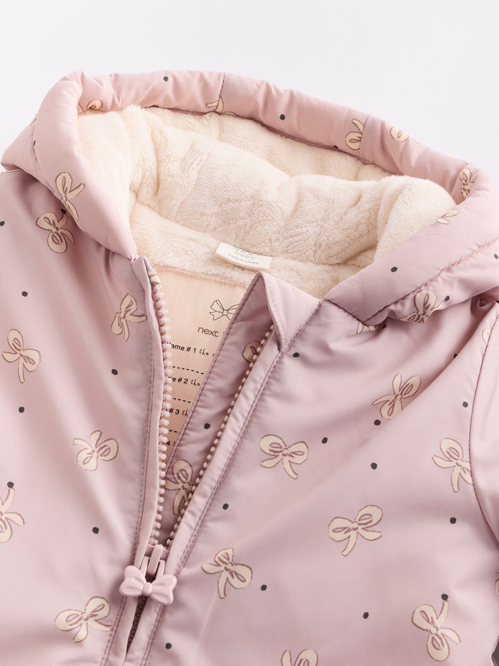 This cosy puffer coat is a stylish addition to their wardrobe that is perfect to keep them warm during the colder months, available in a grey bow print with super lightweight padding, a full zip fastening and a warm faux fur lining, finished with elasticated cuffs. Regular fit Lightweight padding Zip fastening Faux fur lining Elasticated cuffs Machine washable. Main 100% Recycled polyester. Lining 100% Recycled polyester. Wadding 100% Recycled polyester. Country of Origin: China Warning: Keep away from fire and flames.