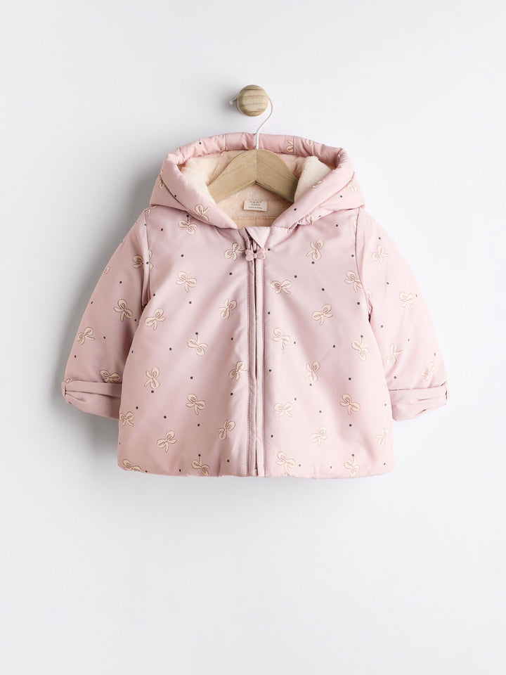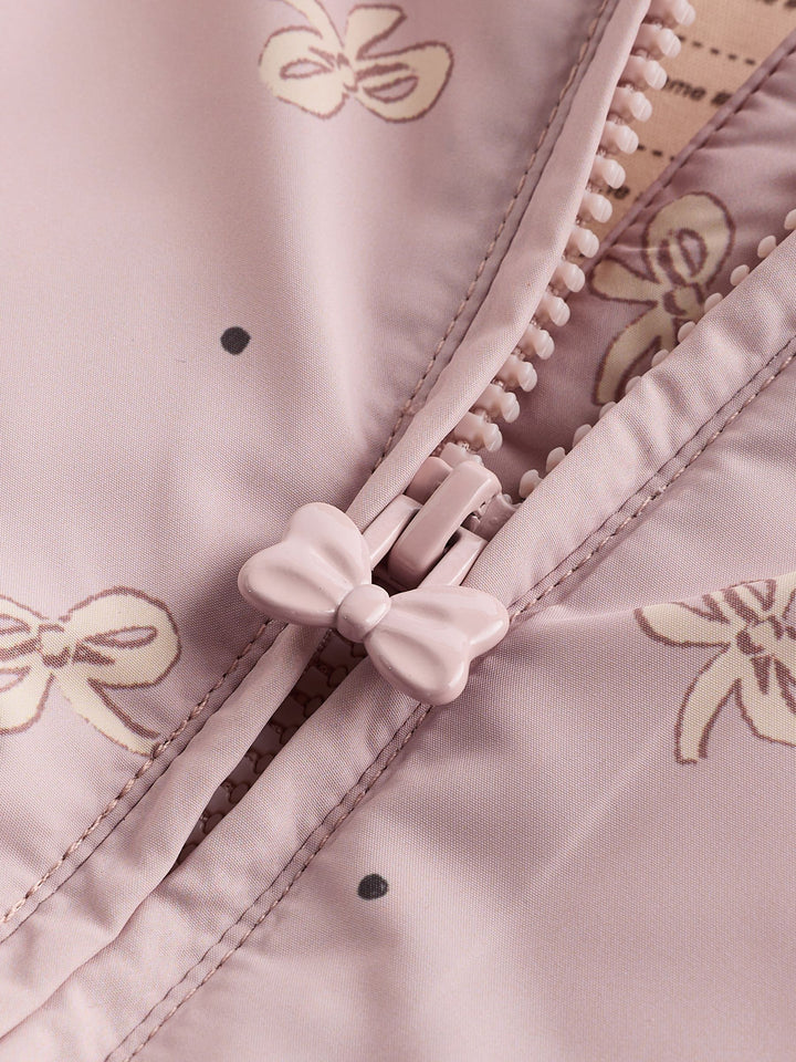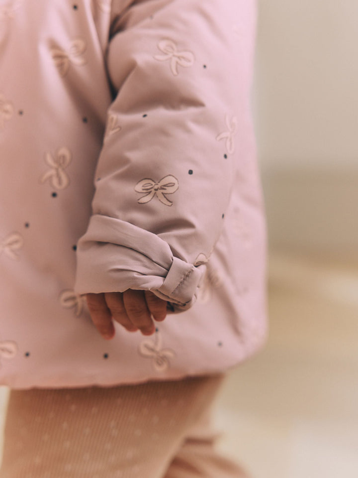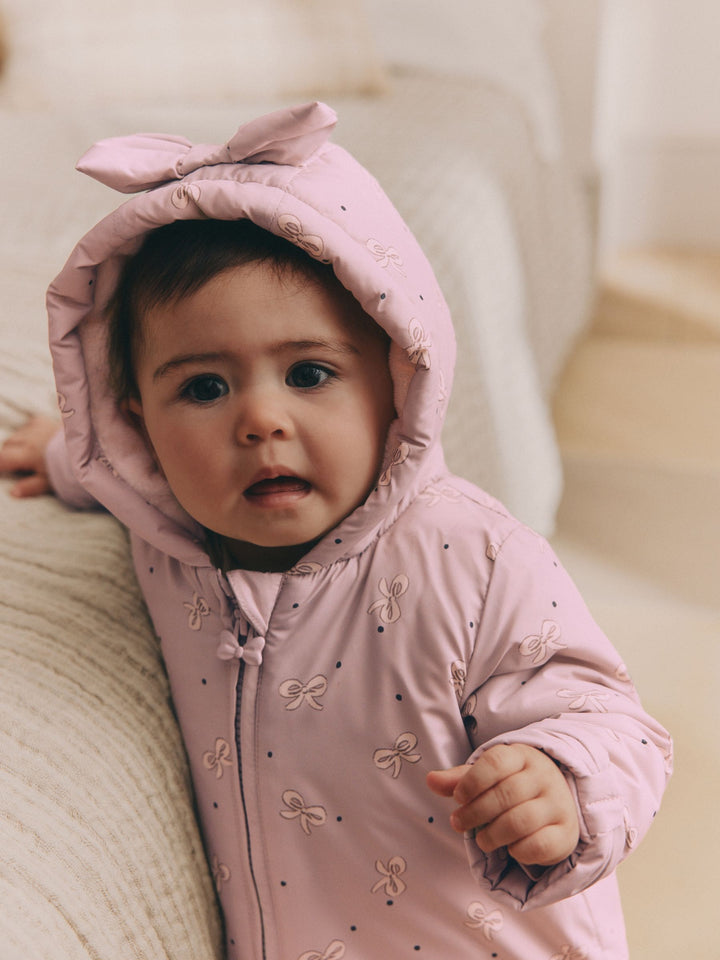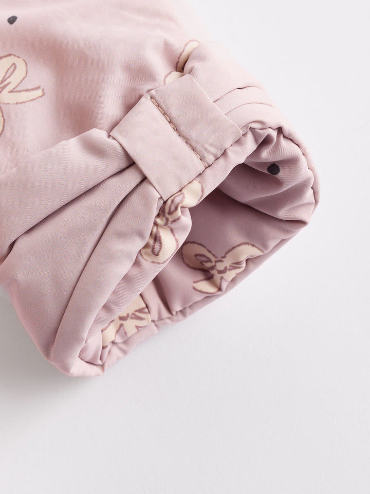 This cosy puffer coat is a stylish addition to their wardrobe that is perfect to keep them warm during the colder months, available in a grey bow print with super lightweight padding, a full zip fastening and a warm faux fur lining, finished with elasticated cuffs. Regular fit Lightweight padding Zip fastening Faux fur lining Elasticated cuffs Machine washable. Main 100% Recycled polyester. Lining 100% Recycled polyester. Wadding 100% Recycled polyester. Country of Origin: China Warning: Keep away from fire and flames.