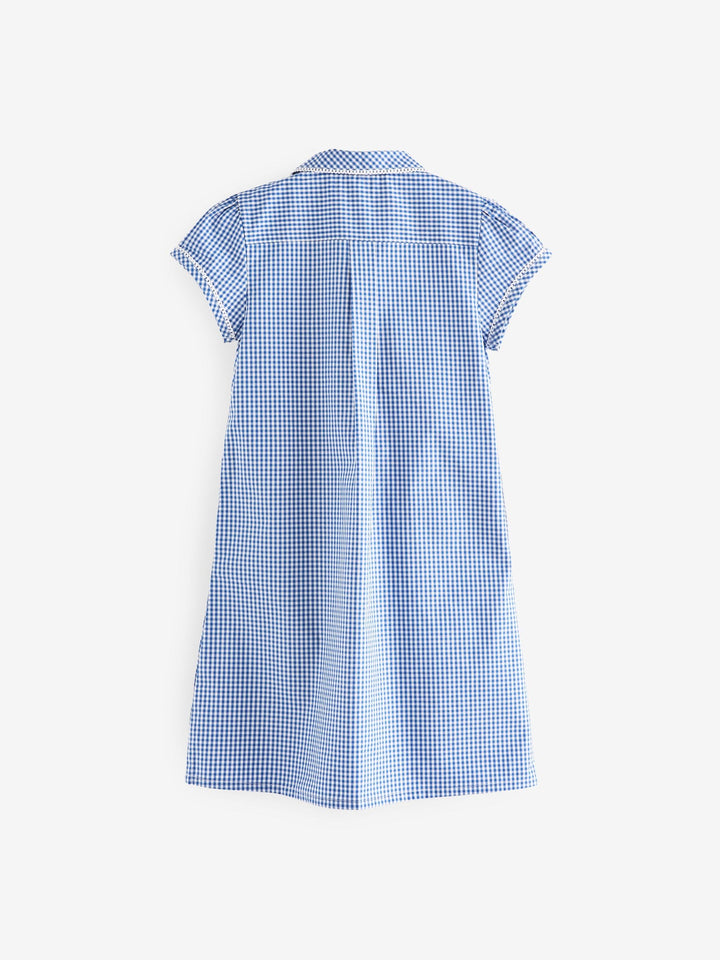 Mid Blue Cotton Rich Button Front Lace Gingham School Dress (3-14yrs)
