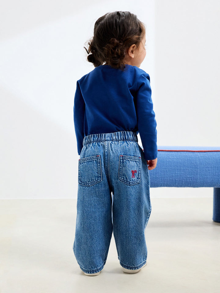 She'll love the sweet style of these Mid Blue Denim Bow Embroidered Jeans. These adorable pull-on jeans offer ultimate comfort with a fully elastic waist, making dressing easy and fuss-free. The mid-blue wash denim is decorated with a charming, all-over bow design through delicate embroidery. Functionality comes via practical pockets, including front and back styles. Subtle details elevate the look: small red stitch detail to the buttons and a tiny red embroidered bow on the back pocket complete this cute and playful denim staple. Pull-on Elasticated waist Bow design Pocket detail 100% Cotton. Country of Origin: Bangladesh