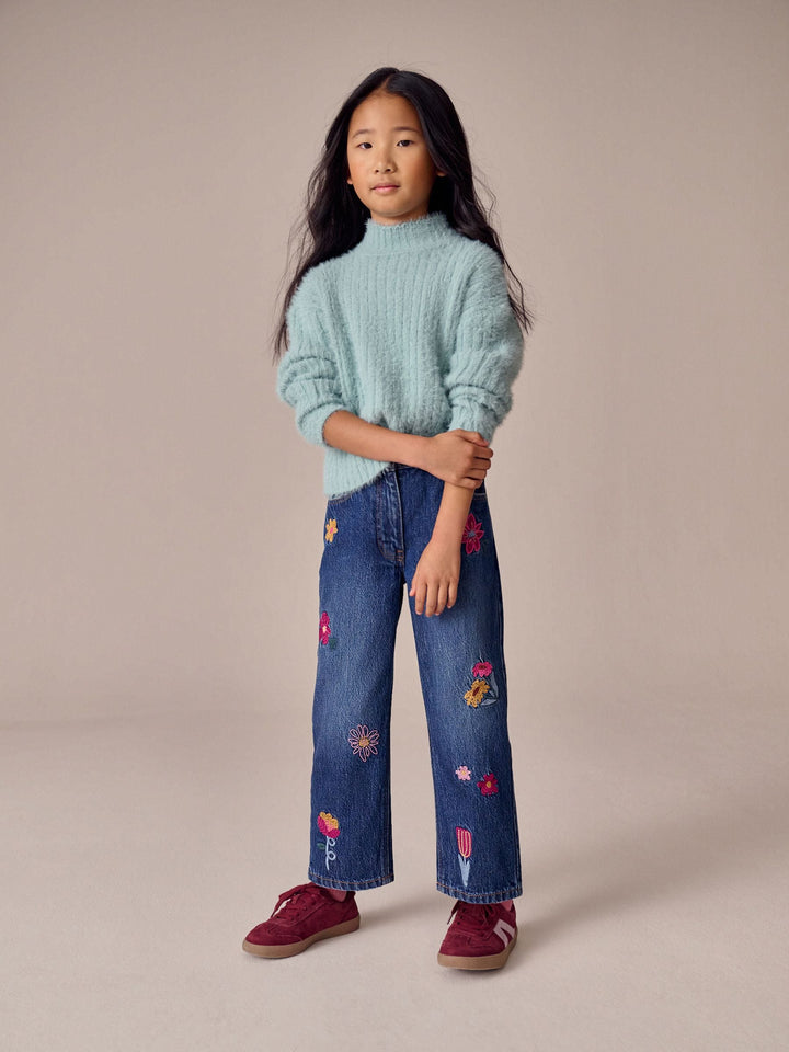 Mid Blue Floral Embroidered Straight Leg Jeans (3-16yrs)