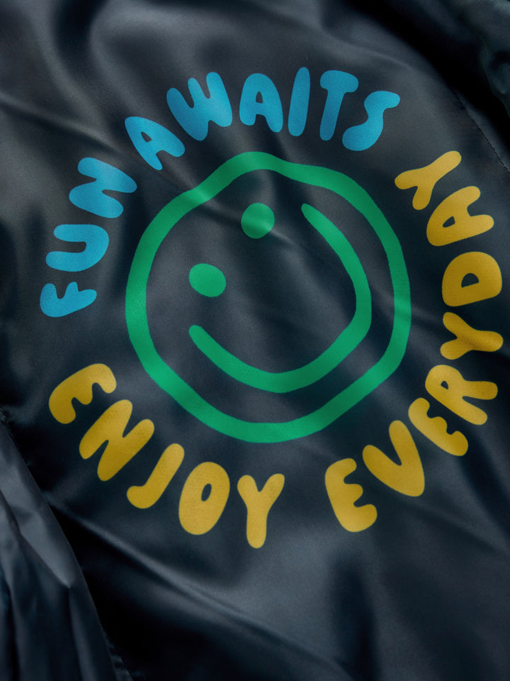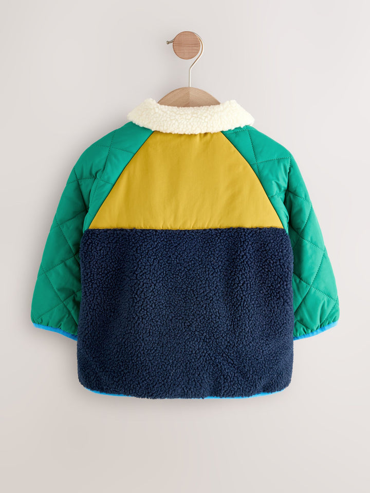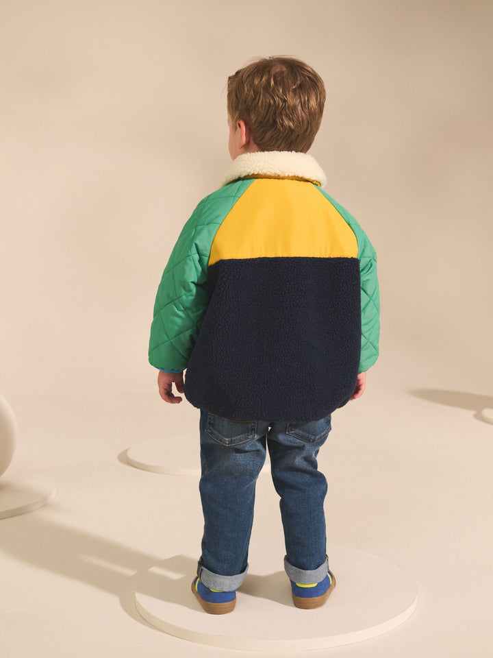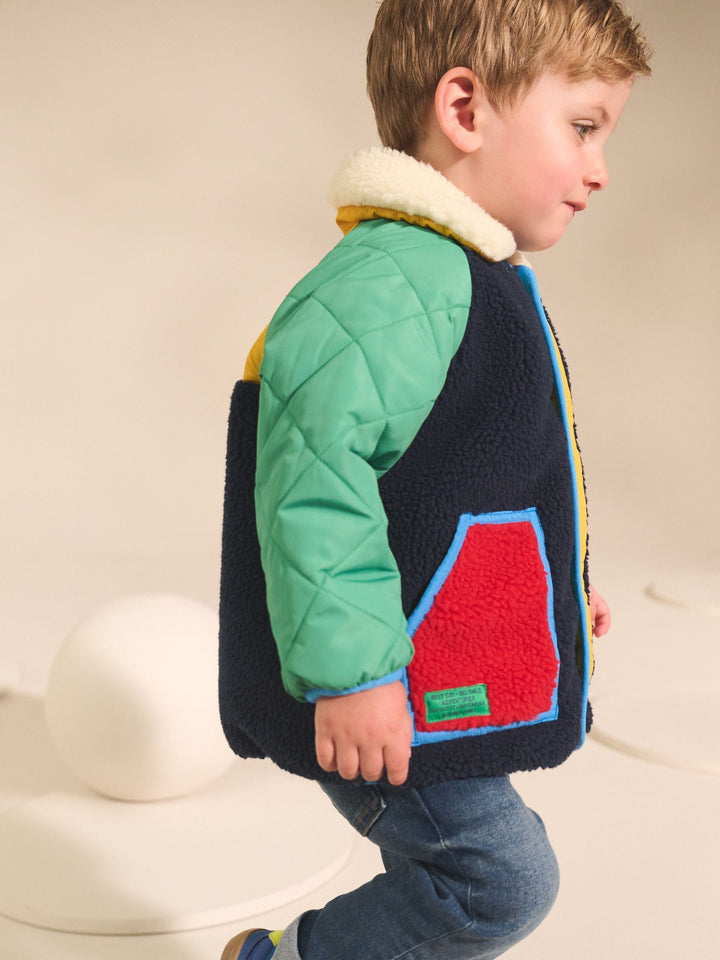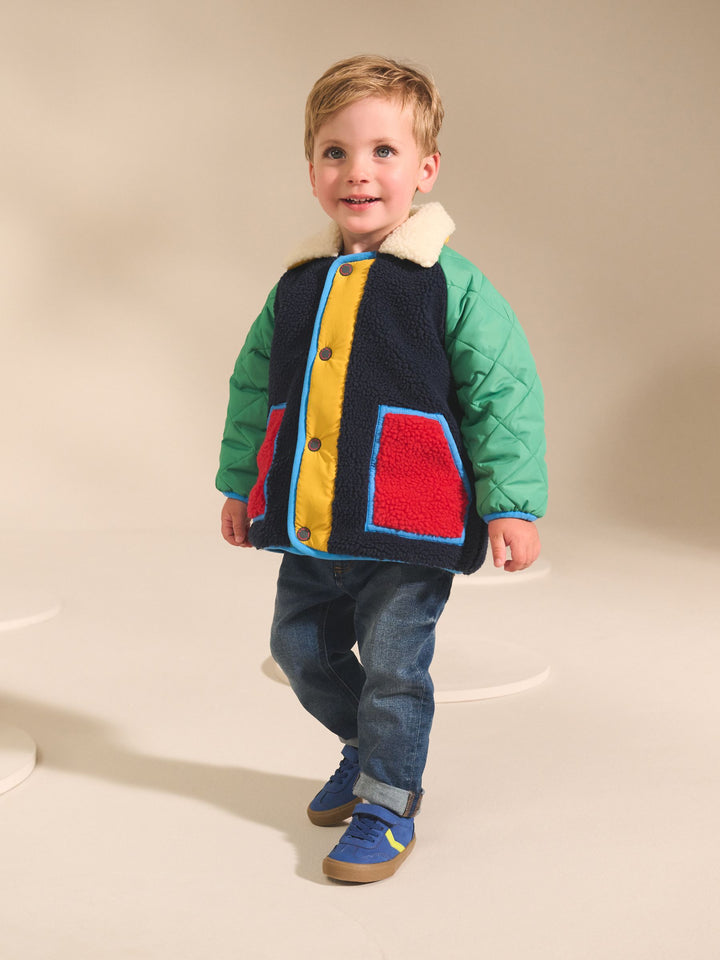 This vibrant Multi Colourblock Borg Coat is ready for playtime adventures. Crafted from cosy borg fabric with bright woven panels, the regular fit is perfect for layering. It features a fun printed lining with the phrase 'Fun Awaits, Enjoy Everyday', and a secure zip front fastening with a popper storm flap to keep little ones warm. Available in sizes from 3 months to 7 years. Cosy borg fabric Fun printed lining Zip front with popper storm flap Regular fit Available in sizes 3mths-7yrs Best for outdoor playtime and everyday wear Machine washable. Main 100% Polyester. Sleeves 100% Recycled polyester. Lining 100% Recycled polyester. Wadding 100% Recycled polyester. Country of Origin: China