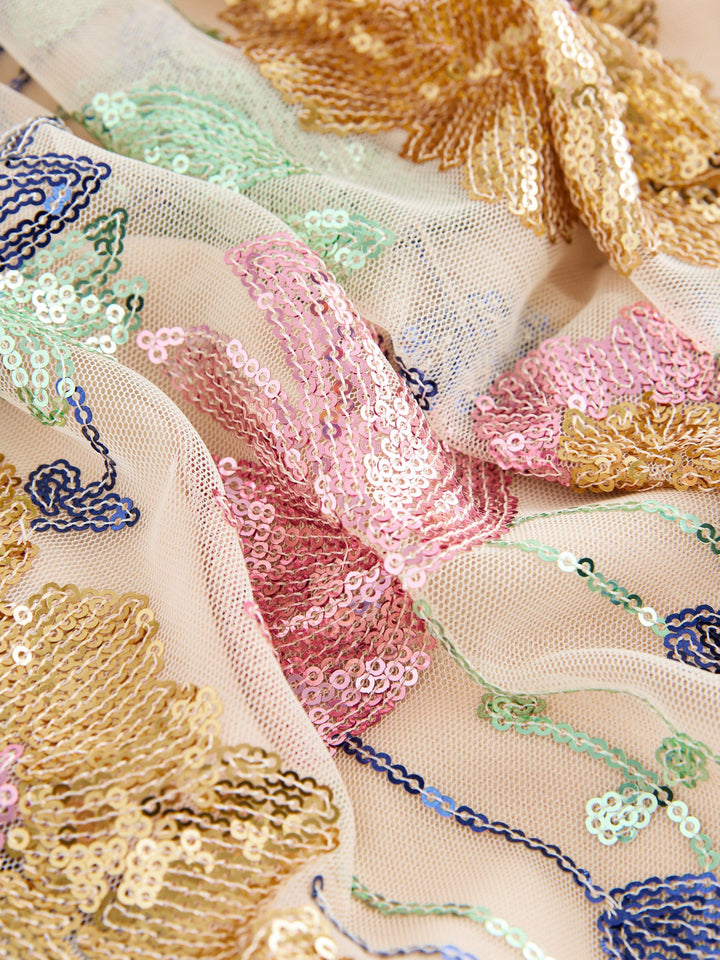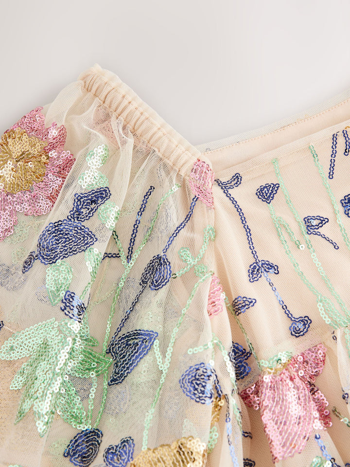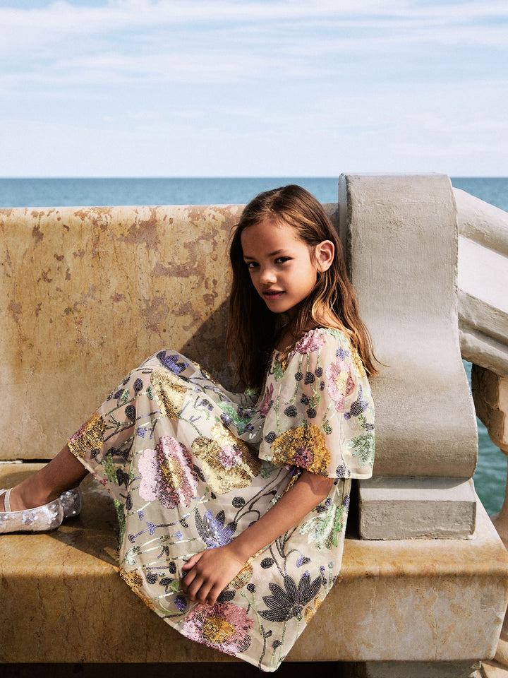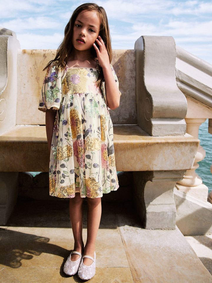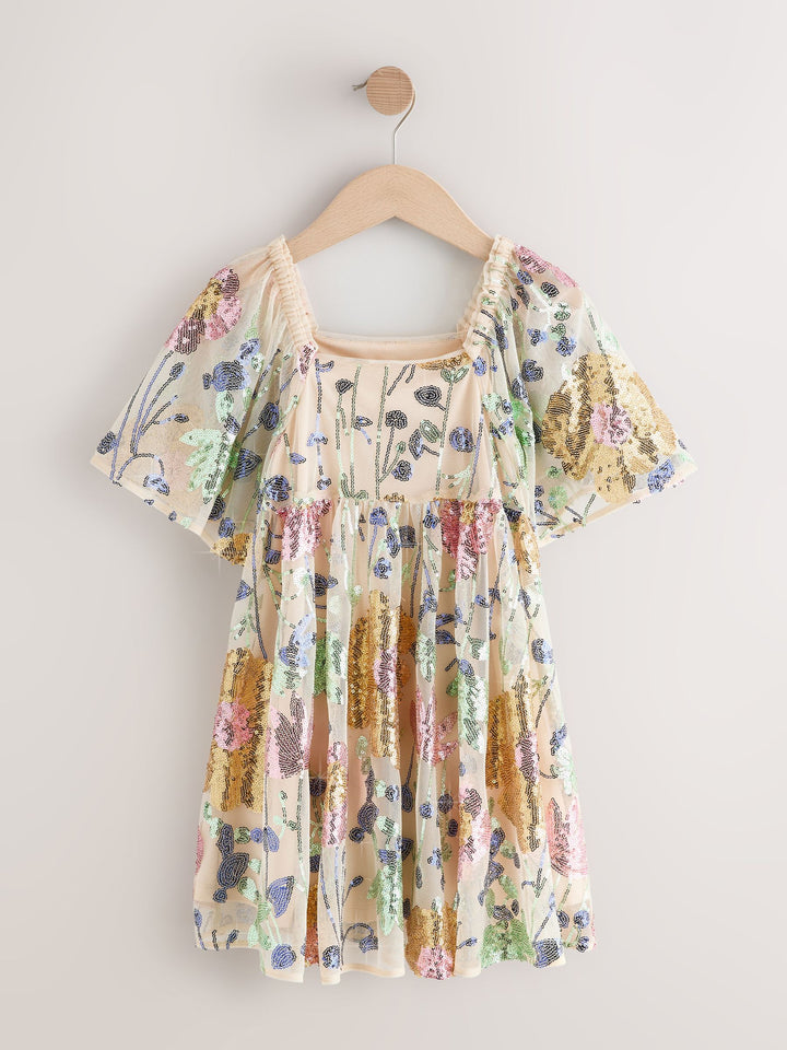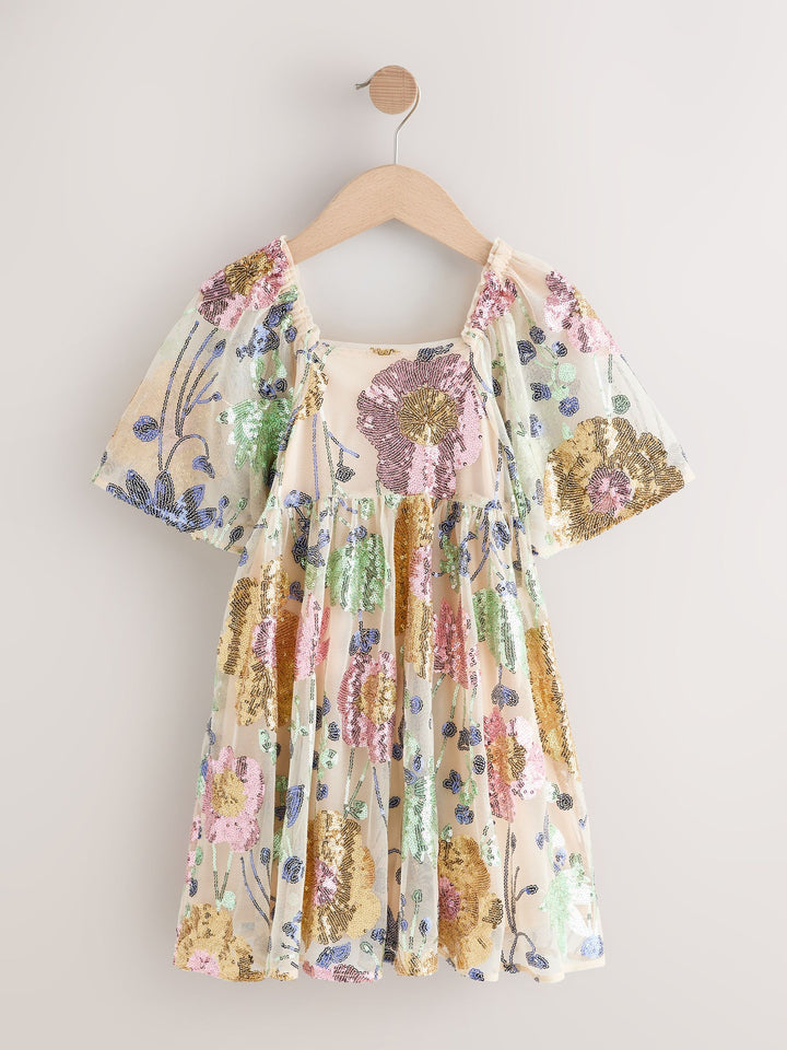 Multi Sequin Flower Print Angel Sleeve Dress (3-16yrs)