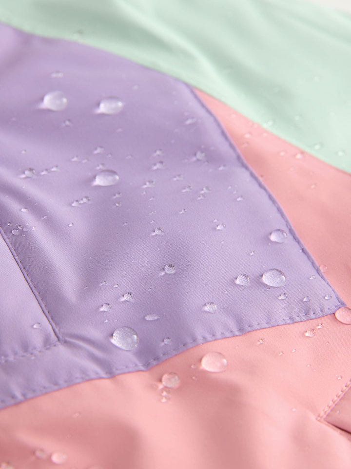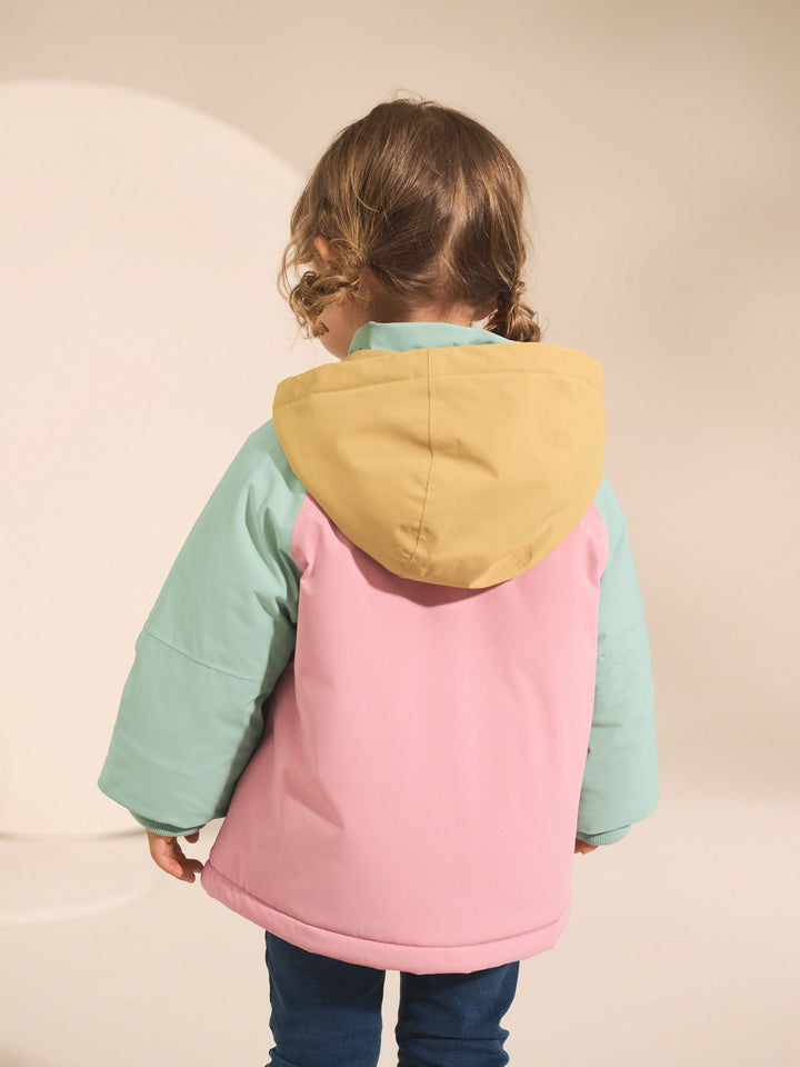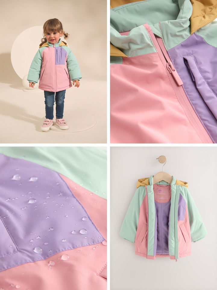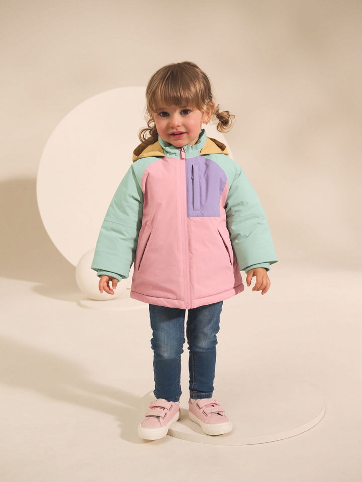 Stay dry in style with this waterproof, multi-coloured jacket. The taped seams and fleece-lined body and pockets provide ultimate warmth and comfort. The fun colour-block design, hood, and ribbed cuffs make it a perfect piece for keeping warm and dry on rainy days. Waterproof Taped seam Fleece-lined Rib cuffs Machine washable. Main 100% Recycled polyester. Lining 100% Recycled polyester. Wadding 100% Recycled polyester. Country of Origin: Myanmar