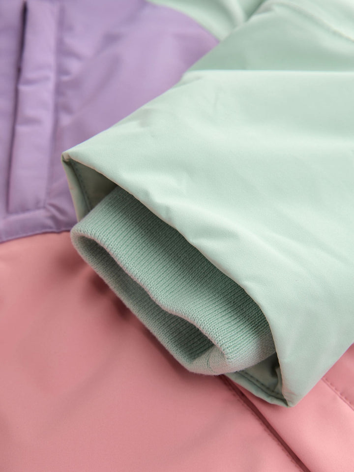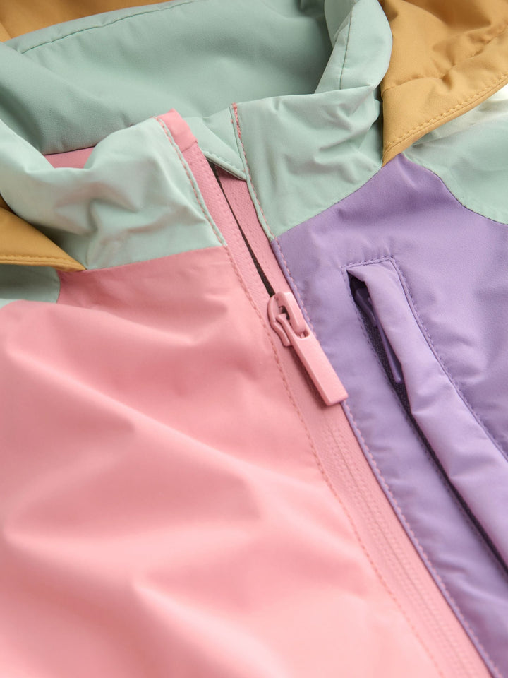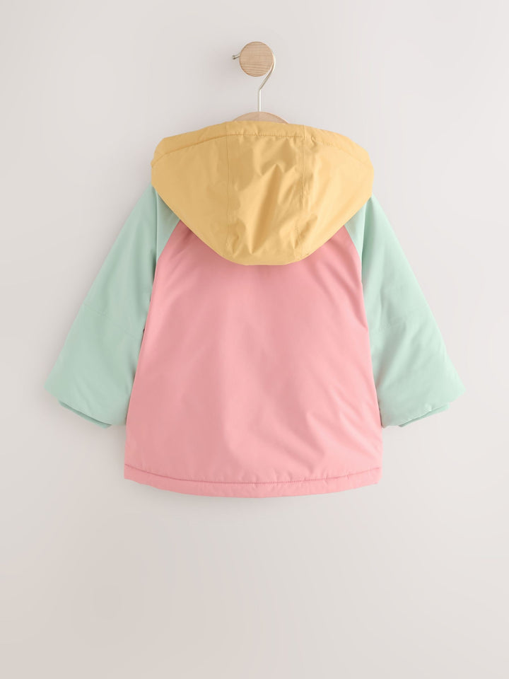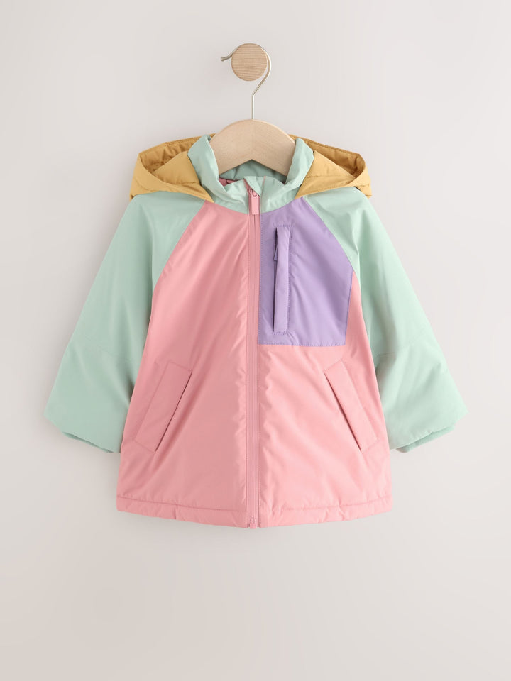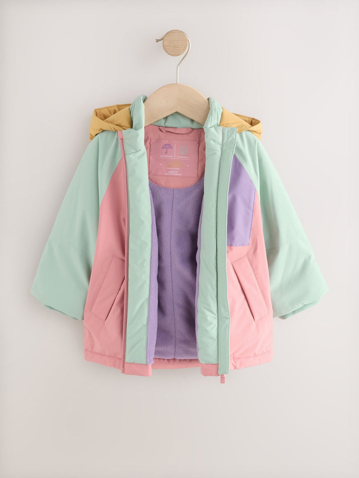 Stay dry in style with this waterproof, multi-coloured jacket. The taped seams and fleece-lined body and pockets provide ultimate warmth and comfort. The fun colour-block design, hood, and ribbed cuffs make it a perfect piece for keeping warm and dry on rainy days. Waterproof Taped seam Fleece-lined Rib cuffs Machine washable. Main 100% Recycled polyester. Lining 100% Recycled polyester. Wadding 100% Recycled polyester. Country of Origin: Myanmar