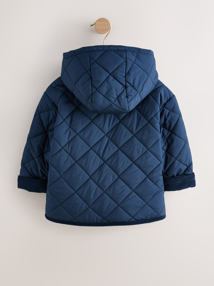 Your little one will stay warm and cosy in this classic navy quilted coat. The soft, borg lining and wadded design provide extra warmth, while the quilted pattern and heritage style add a timeless feel. With a zip-up fastening and hood, it's a practical and stylish choice for their outdoor adventures. Quilted design Borg lining Faux-fur lining Wadded for extra warmth Hooded Zip and snap button fastening Machine washable. Main 100% Recycled polyester. Lining 100% Recycled polyester. Wadding 100% Recycled polyester. Country of Origin: China