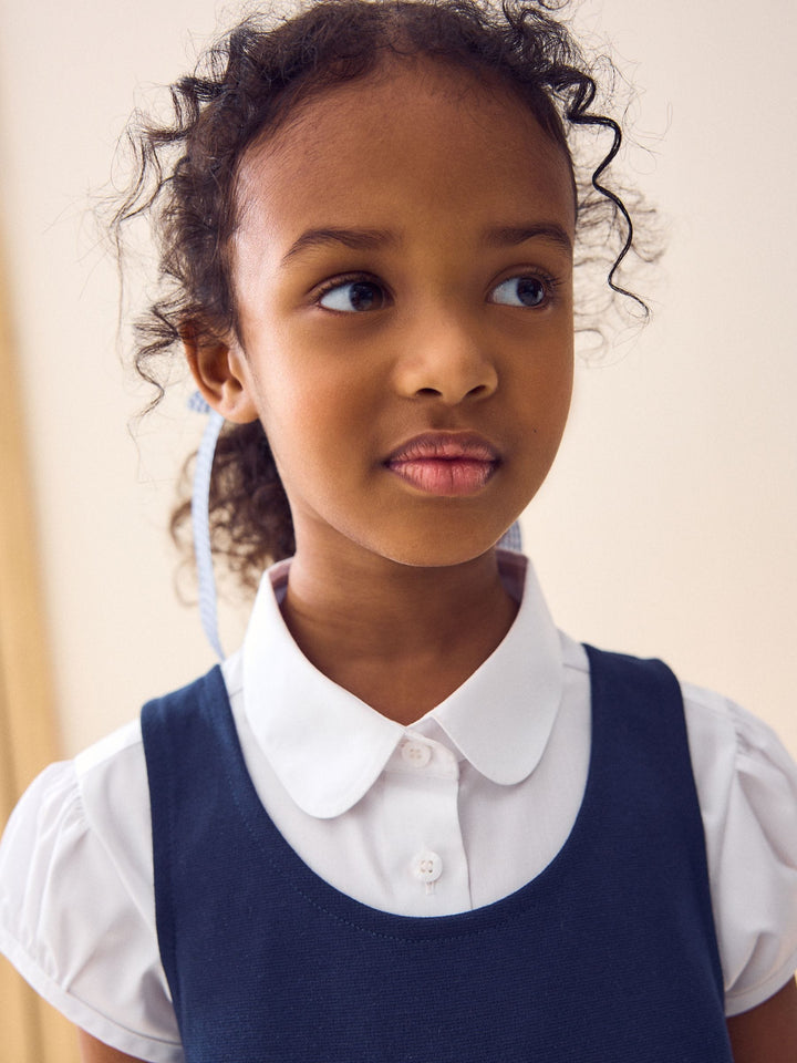 Take the stress out of school mornings with our Dressing Made Easy School Uniform Collection. Featuring pull on trousers, skirts and dresses alongside hidden touch fastenings, printed labels and elasticated waists. Getting ready for school has never been easier. A schoolwear essential for her classroom adventures, this pinafore is made from a stretchy and soft jersey fabric. Dressing made easy with no zips or buttons, this dress is perfect for layering over her school shirt. With a round neck and sleeveless design this pinafore is complete with fun bow detail on the front. Key features Machine Washable Soft jersey fabric Easy dressing with no fastening Round neckline Bow detailing Machine washable. 75% Recycled polyester, 22% Viscose, 3% Elastane. Country of Origin: Myanmar