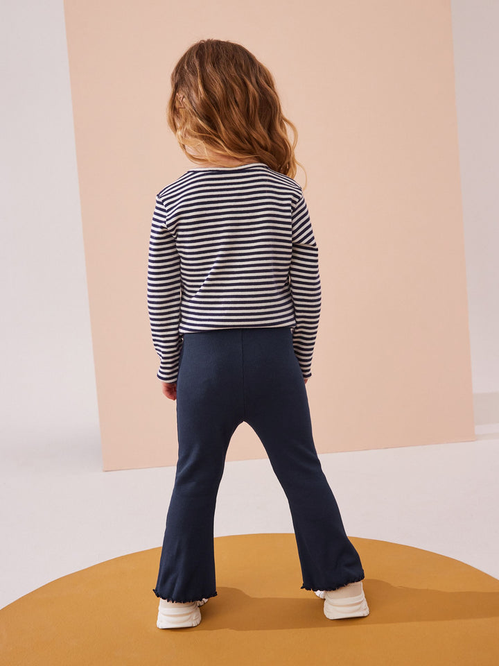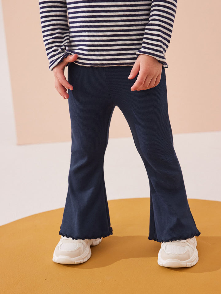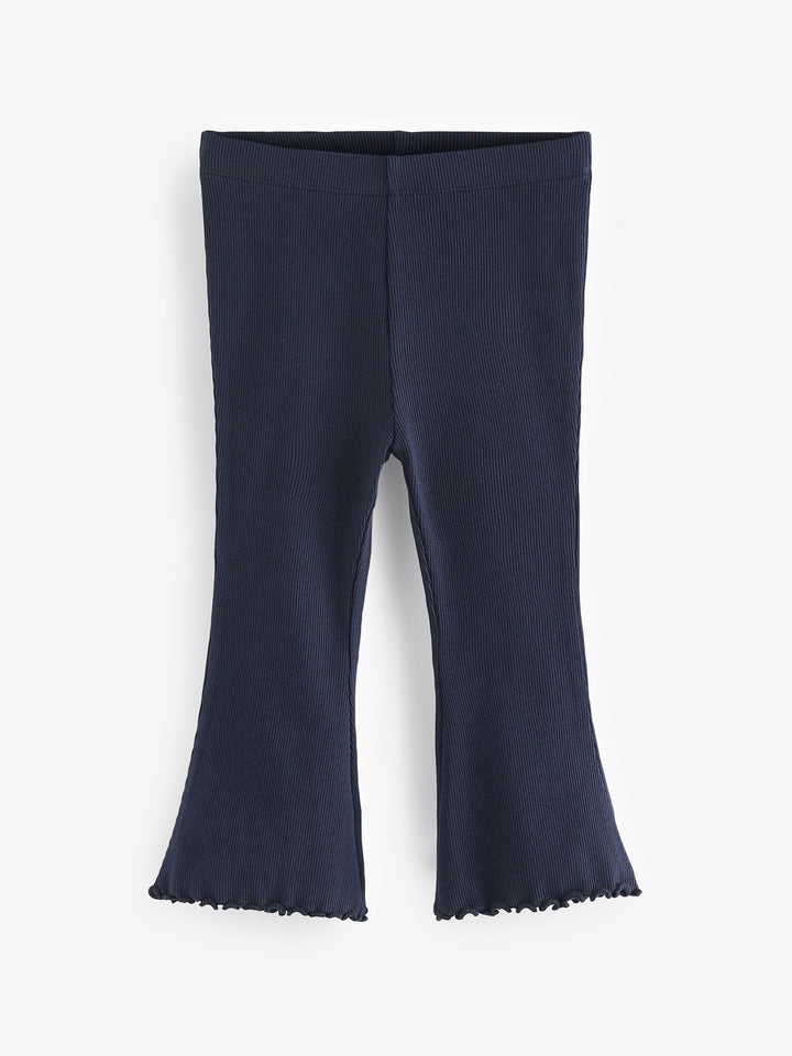 Level-up her everyday looks with our rib flare navy leggings. Made from a cotton rich blend for added comfort and finely finished with lettuce trim edges, an elasticated waistband and ribbed detailing. Ribbed cotton stretch fabric Elasticated waistband Pull-On style Wide-leg shape Lettuce trim edges Machine washable. 95% Cotton, 5% Elastane. Country of Origin: Bangladesh