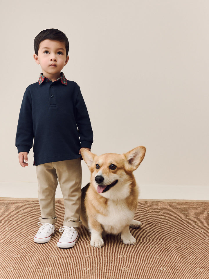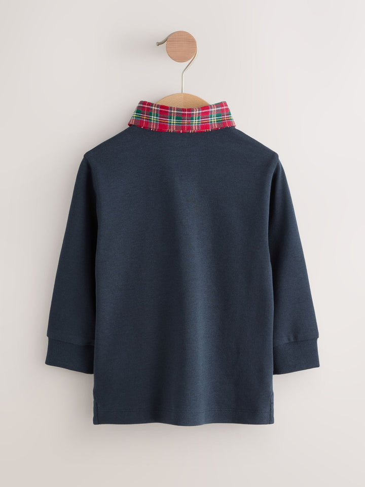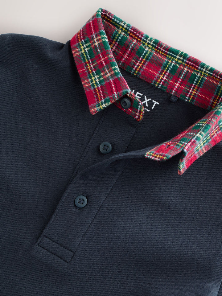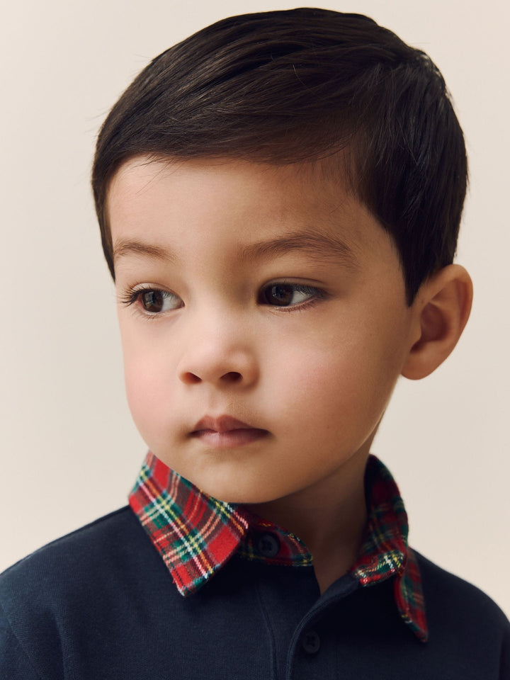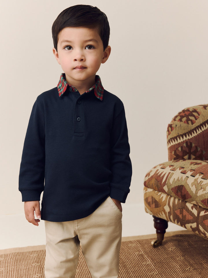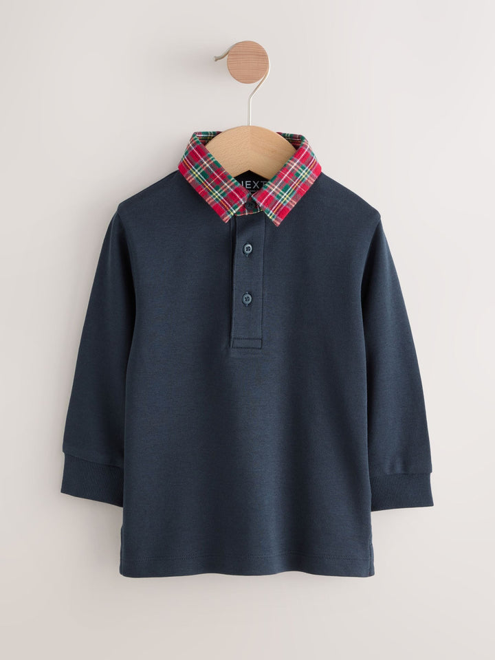 Navy Tartan Collar Long Sleeve Polo Shirt (3mths-7yrs)