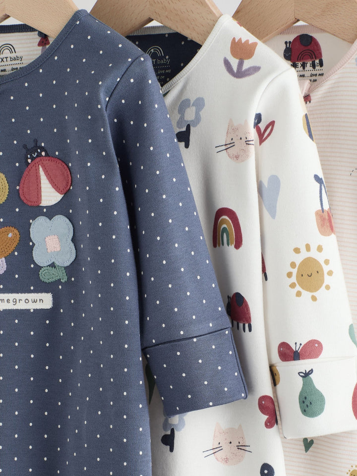 Keep your little one cosy in this 3 pack of sleepsuits. The super soft cotton fabric is gentle on their skin, while the two-way zip fastening makes dressing and nappy changes quick and easy. With a mix of charming print designs and plain options, these sleepsuits are finished with inner lined feet and turn-back scratch mitts up to 3-6 months. 100% cotton Two-way zip fastening Turn-back scratch mitts up to 3-6 months Inner lined feet Anti-slip sole print from 9-12 months No harmful chemicals or dyes Nickel-free poppers 3 pack Machine washable. 3 x Sleepsuit 100% Cotton. Country of Origin: India Warning: Keep away from fire and flames.