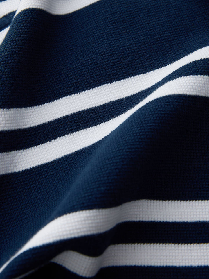 In pure cotton, this navy/white stripe polo shirt features a popper neck placket, short sleeves and collar. 100% cotton Popper neck fastening Short sleeves Collar Stripe design Machine washable. 100% Cotton. Country of Origin: Bangladesh