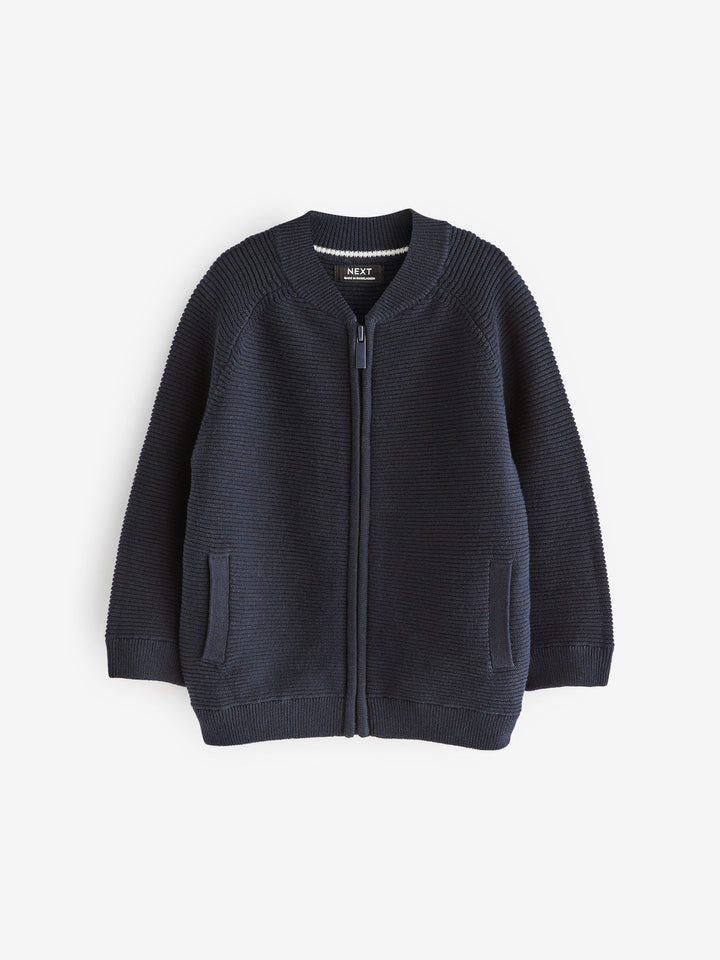 This Navy cardigan has a stylish bomber-style shape with a cosy rib knitted construction, featuring long raglan sleeves, a zip fastening and ribbed cuffs. Welted slant pockets decorate the sides. 100% cotton Zip fastening Bomber design Side pockets 100% Cotton. Country of Origin: Bangladesh