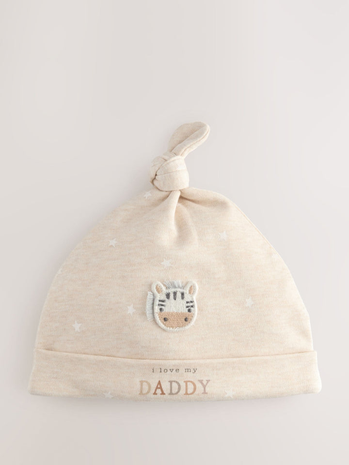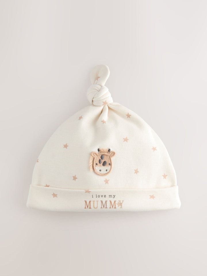 This 2-pack of baby hats feature an adorable 'I love my Mummy' and 'I love my Daddy' slogan with an embroidered zebra and giraffe design, an all-over print and a tie top, made from pure cotton. 2-pack 100% cotton Tie top Machine washable. 2 x Hat Main 100% Cotton. Inner Lining 100% Cotton. Country of Origin: Bangladesh Warning: Keep away from fire and flames.