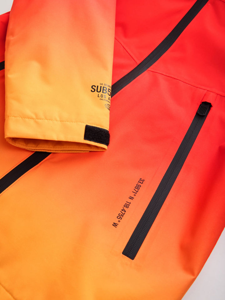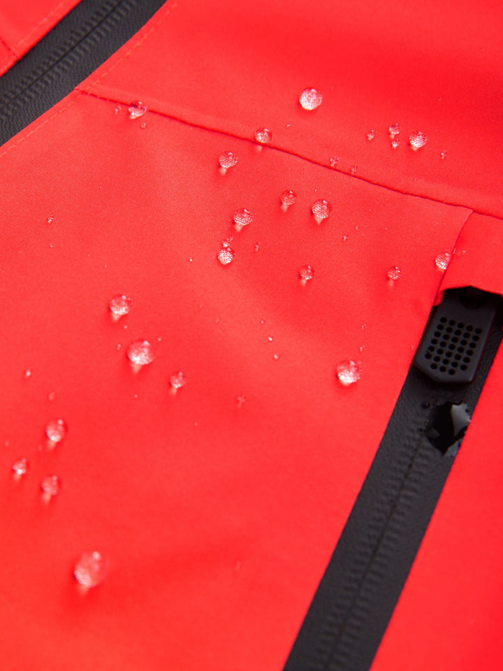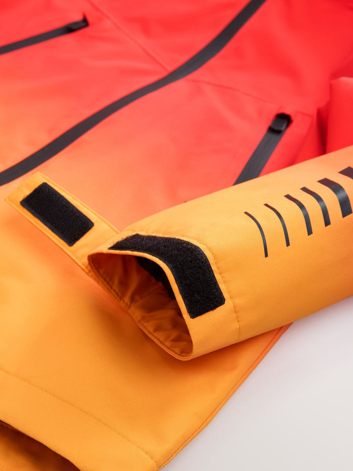 Perfect for poor weather, this waterproof jacket has a bright red and orange design with a cosy microfleece lining, featuring a zip fastening, dual zip side pockets, a set-in hood and touch-fastened sleeve cuffs. Waterproof Zip fastening Microfleece lining Windproof Orange and red Machine washable. Main 100% Recycled polyester. Lining 100% Recycled polyester. Country of Origin: Bangladesh