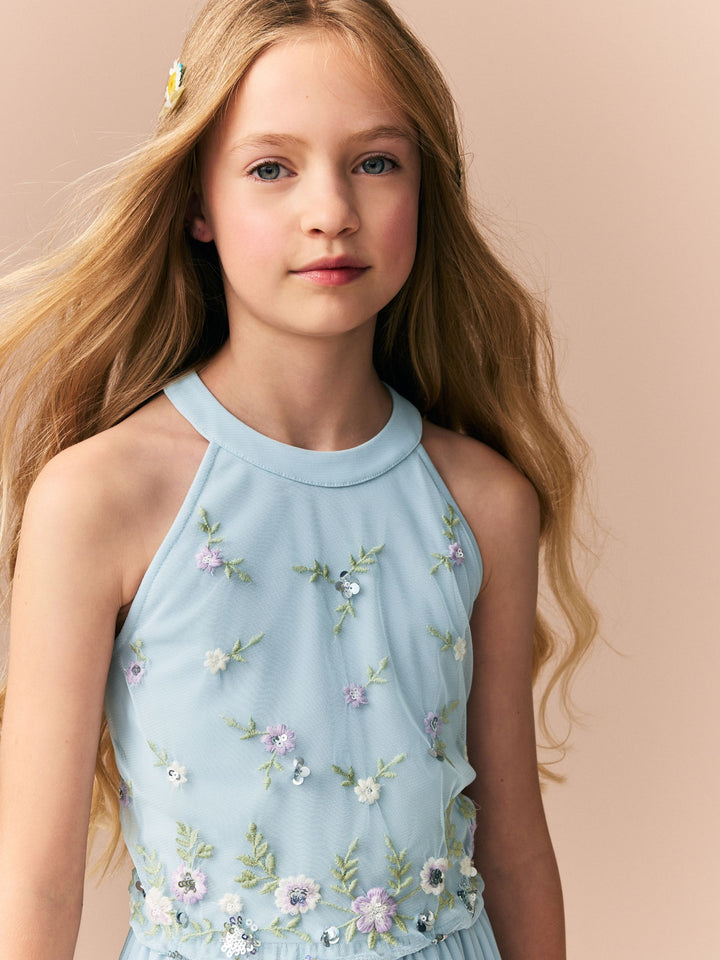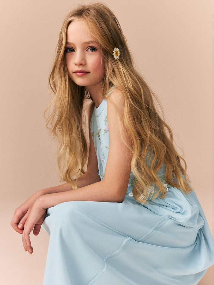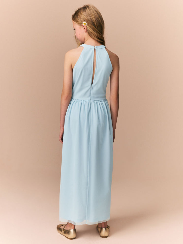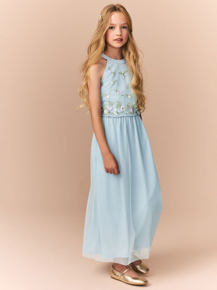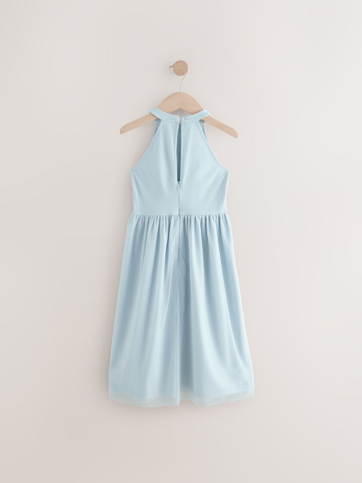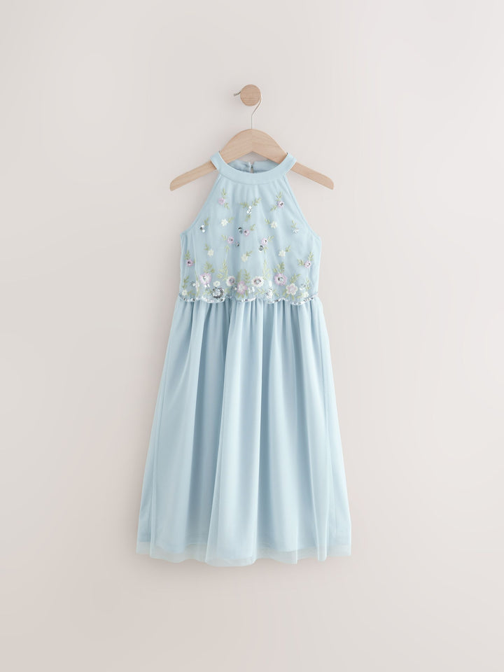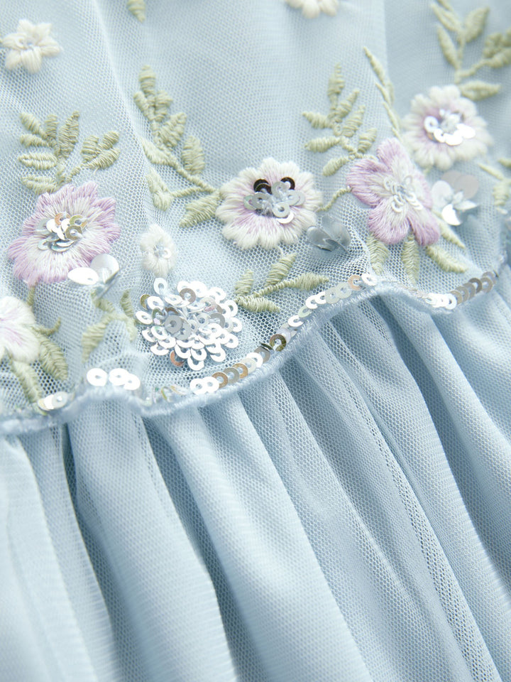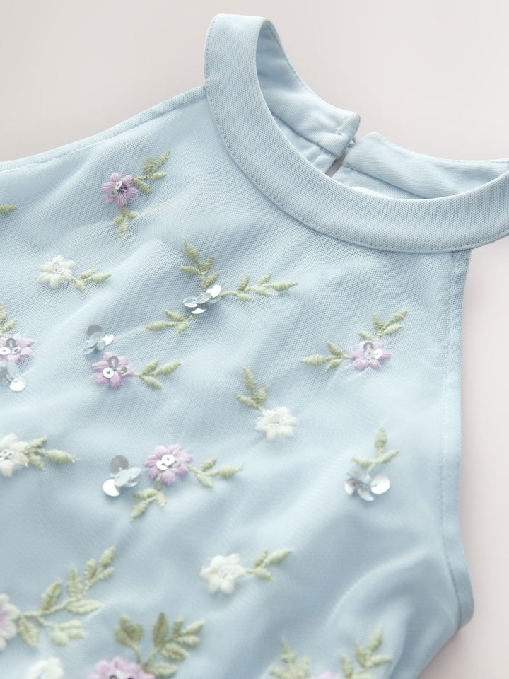Perfect for weddings and other special occasions, this lovely pale blue dress blends a soft chiffon fabric with a comfortable jersey lining, decorated with floral embellishments, a round collar and a button and zip fastening to the back. Chiffon fabric Jersey lining Round collar Floral embellishments Button and zip fastening Main 100% Polyester. Lining 100% Polyester. Country of Origin: India