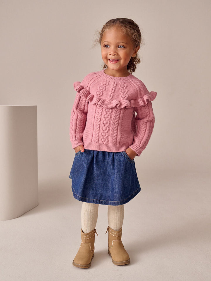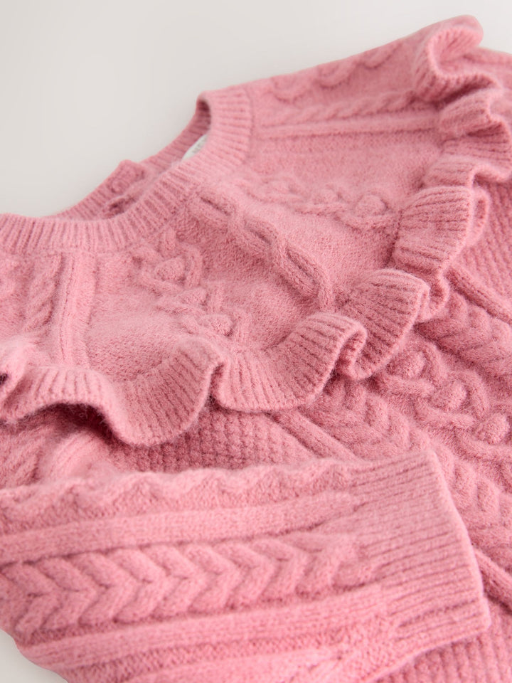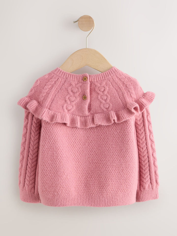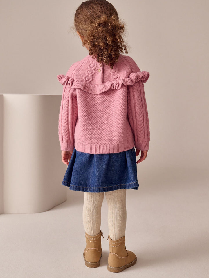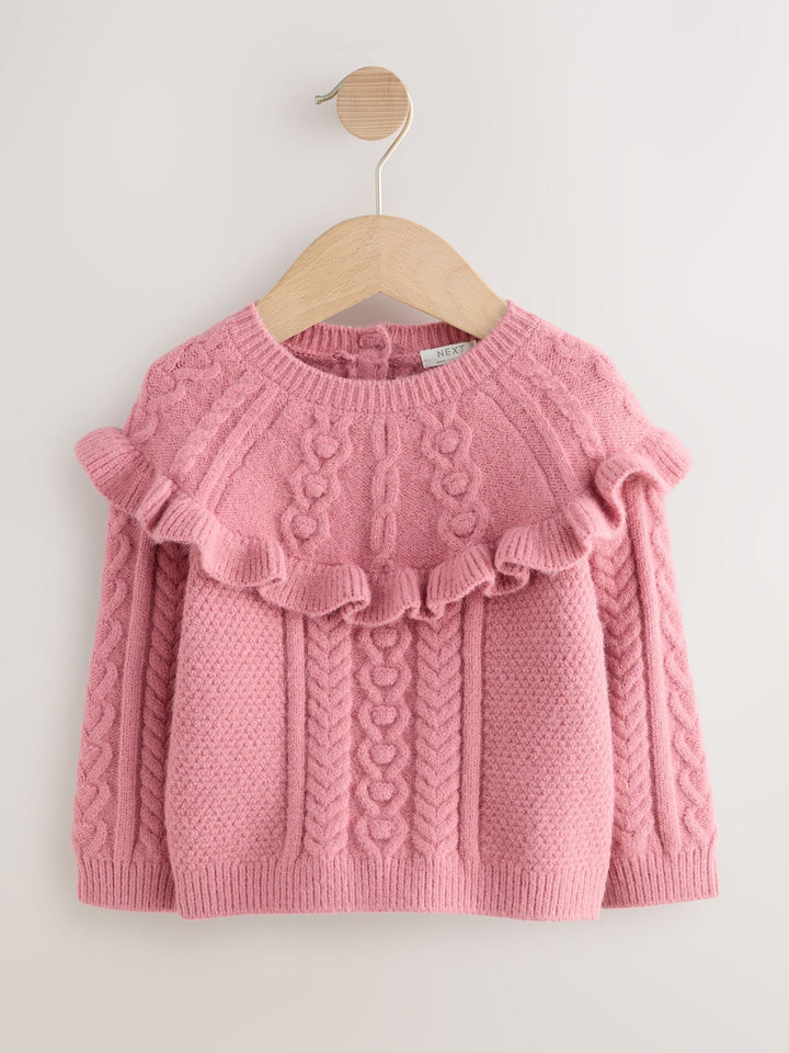 The jumper is an Intricate cable knit, incorporating a mix of vertical cables and diamond patterns on the body and sleeves, giving it a classic, cosy feel. The most distinguishing feature is the large, decorative ruffle that runs across the shoulders and chest like a yoke, adding a whimsical and sweet touch 42% Acrylic, 30% Nylon, 28% Polyester. Country of Origin: Myanmar