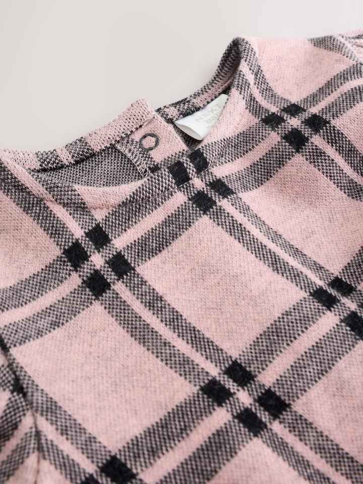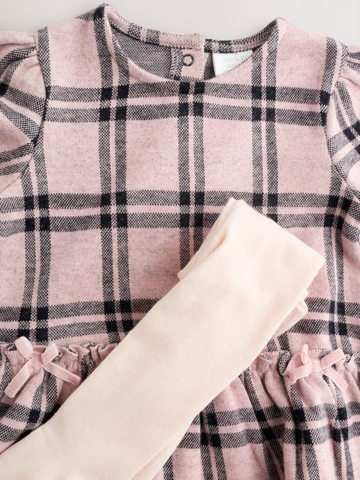 Unbox an adorable outfit with this pink check dress and tights set. Made from a supersoft brushed check fabric, the long-sleeve dress features a frill waist and sweet-bow details. Paired with coordinating tights, it's a perfect choice for keeping your little one cosy and stylish. Supersoft brushed check fabric Frill-waist detail Bow details Long sleeves Crew neck Tights included Machine washable. Dress 85% Cotton, 15% Polyester. Tights 73% Cotton, 25% Nylon, 2% Elastane. Country of Origin: India Warning: Keep away from fire and flames.