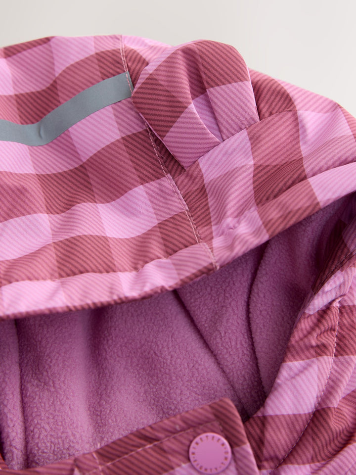 Stay dry in style with this pink check waterproof jacket. The taped seams and fleece-lined body and pockets provide ultimate warmth and comfort. The fun design and hood make it a perfect piece for keeping warm and dry on rainy days. Waterproof Taped seam Fleece-lined Machine washable. Main 100% Recycled polyester. Lining 100% Recycled polyester. Wadding 100% Recycled polyester. Country of Origin: Myanmar