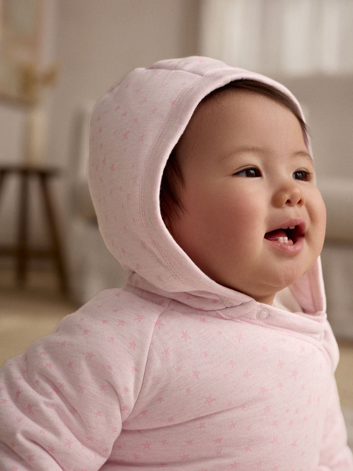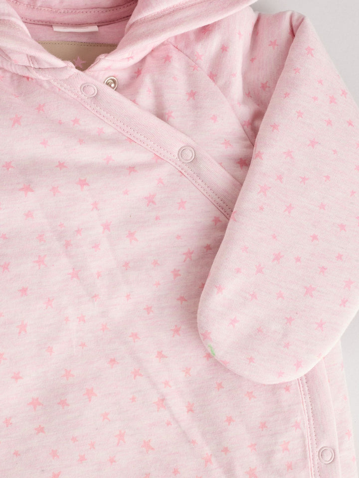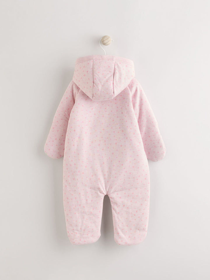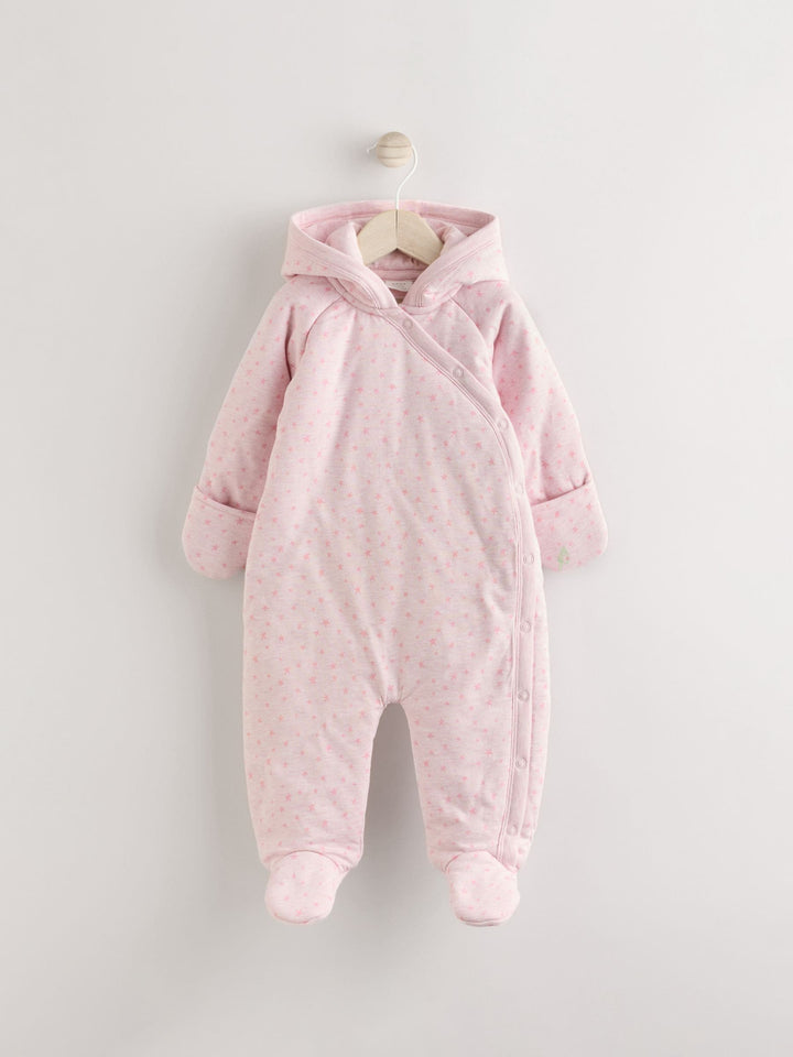 This cosy pink all-in-one has a warm wadded design with a cotton main fabric and lining, featuring a popper fastening for easy dressing, built-in gloves and inner lined feet, finished with a hood. All-in-one Cotton main Popper fastening Hooded Built-in hands and feet Machine washable. Main 100% Cotton. Main Lining 100% Cotton. Sleeve Lining 100% Recycled polyester. Wadding 100% Recycled polyester. Country of Origin: China Warning: Keep away from fire and flames.