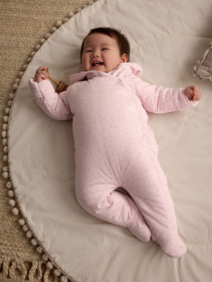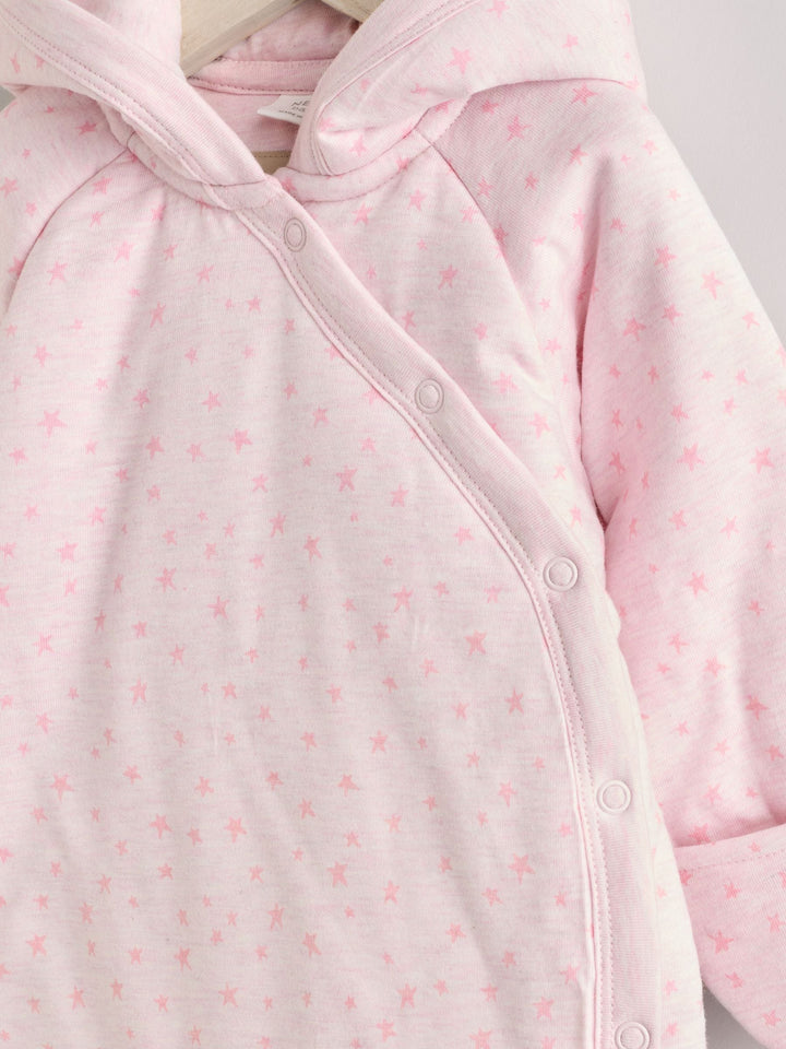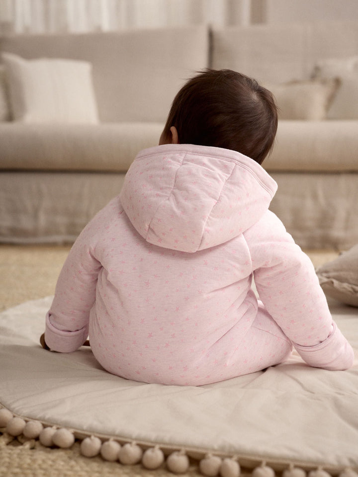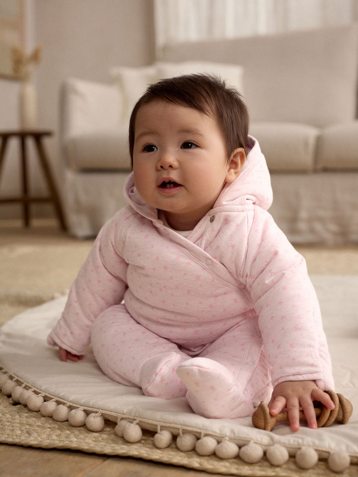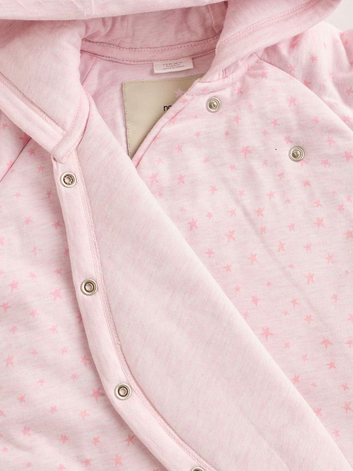 This cosy pink all-in-one has a warm wadded design with a cotton main fabric and lining, featuring a popper fastening for easy dressing, built-in gloves and inner lined feet, finished with a hood. All-in-one Cotton main Popper fastening Hooded Built-in hands and feet Machine washable. Main 100% Cotton. Main Lining 100% Cotton. Sleeve Lining 100% Recycled polyester. Wadding 100% Recycled polyester. Country of Origin: China Warning: Keep away from fire and flames.