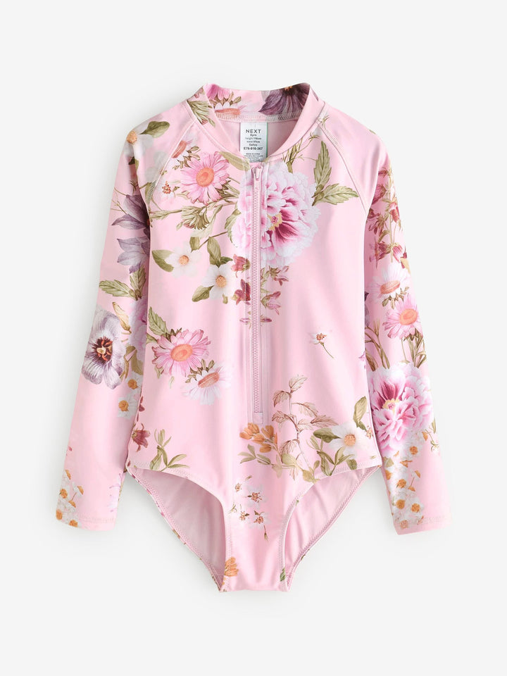 This all-in-one pink floral print swimsuit provides extra coverage to help protect her from the sun, featuring a zip fastening to the front, long sleeves and a high collar. All-in-one Zip fastening Long sleeves High collar Machine washable. Main 82% Recycled polyester, 18% Elastane. Lining 92% Recycled polyester, 8% Elastane. Country of Origin: China This fabric will provide protection against solar ultraviolet radiation. It has been independently tested and given a UPF rating of 50+ which blocks more than 97.5% of UV rays. Important Advice: • Sun exposure causes skin damage • Only covered areas are protected • Always use a high protection factor sunscreen on any exposed areas of skin • The protection offered by this fabric may be reduced with use or if stretched or wet • Always rinse in fresh water after each use • Young children should be kept in the shade between 11 and 3 • Don't forget your hat and sunglasses. • Fabric provides UVA +UVB protection from the sun.