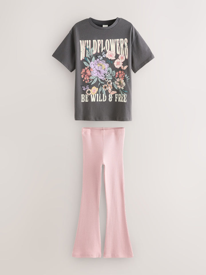Pink Floral T-Shirt and Ribbed Flare 100% Cotton Set (3-16yrs)