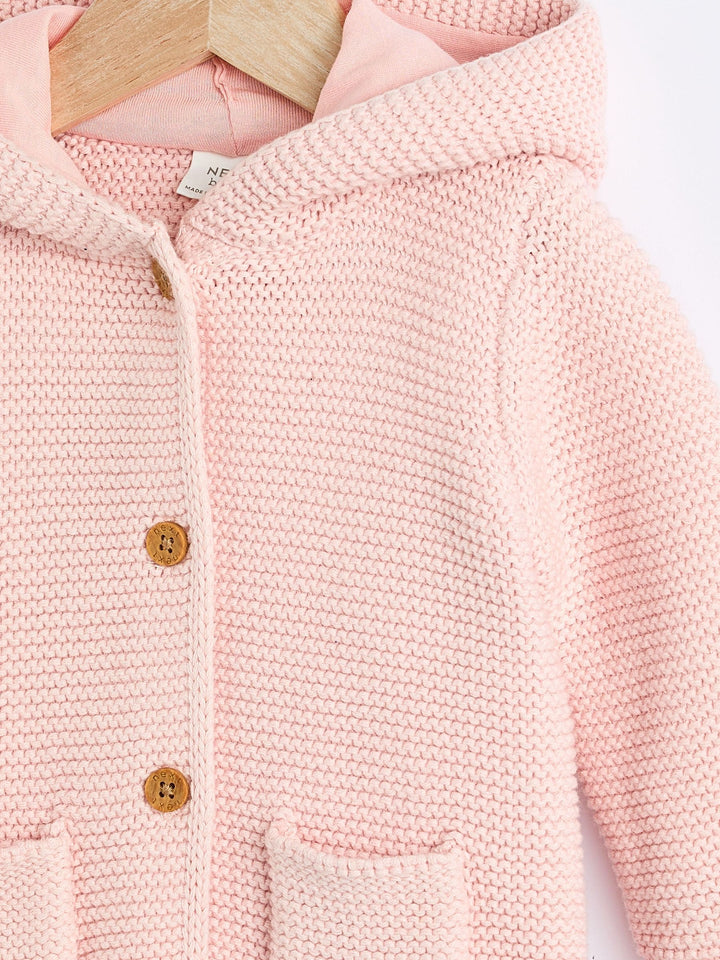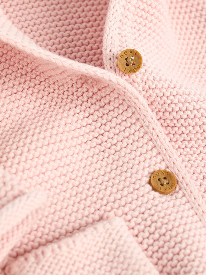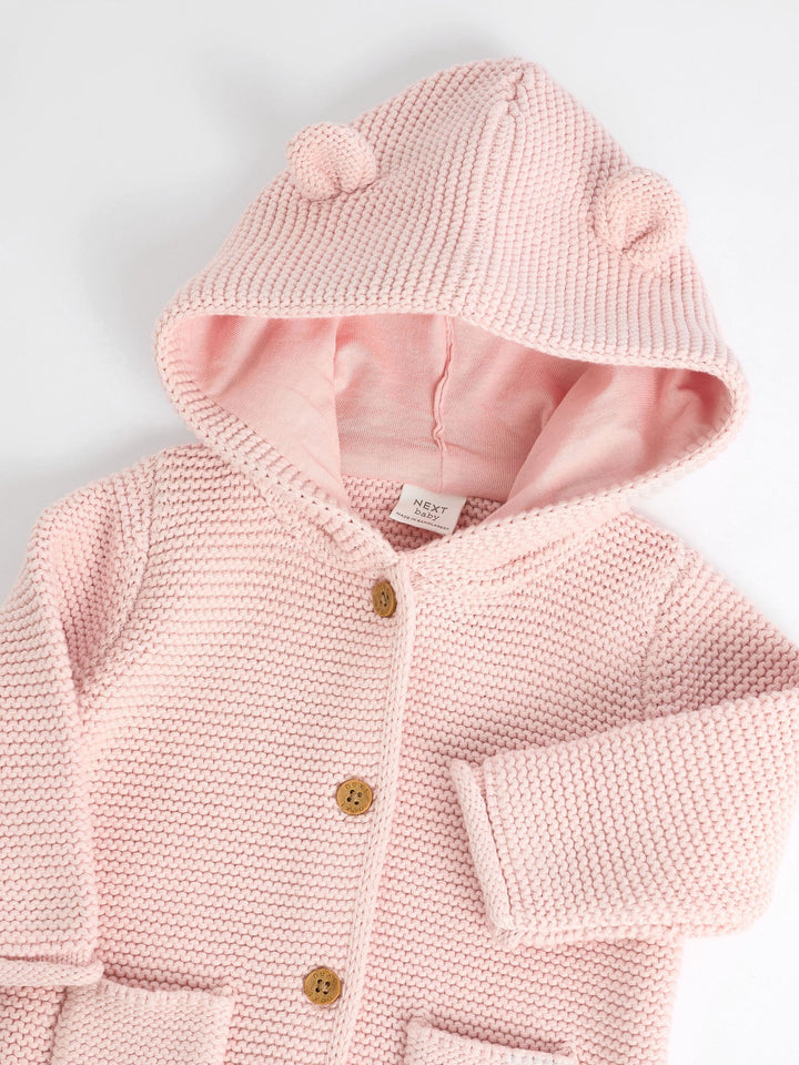 Equal parts cosy and cute, this pink 100% cotton knitted cardigan has a button-up fastening with dual patch pockets and a set-in hood with 3D ears, finished with long sleeves. Regular fit 100% cotton Button-up fastening Dual patch pockets Set-in hood 3D ears Long sleeves Machine washable. Main 100% Organic cotton. Hood Lining 100% Organic cotton. Country of Origin: Bangladesh Warning: Keep away from fire and flames.