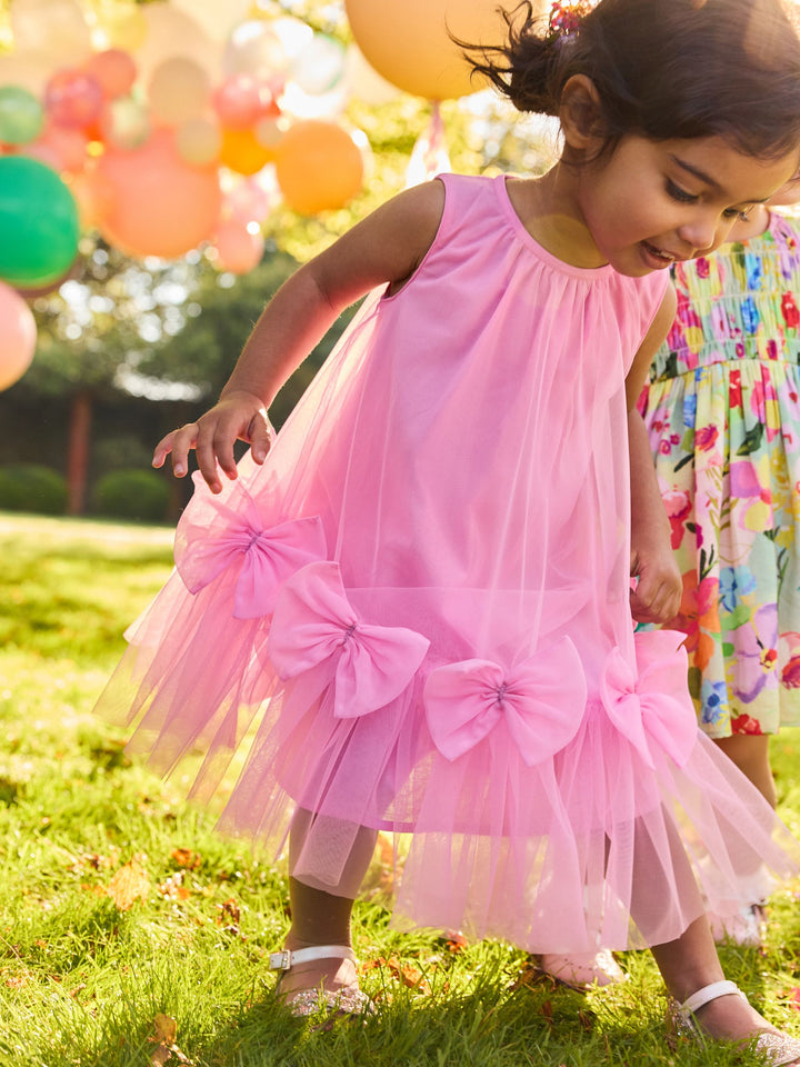 This adorable dress has a bright pink mesh design with 3D bow detailing and a sleeveless shape, finished with a button fastening to the back and a comfortable cotton lining. Perfect for special occasions. Mesh fabric 3D bow detailing Sleeveless Fastening to the back Cotton lining Machine washable. Shell 100% Nylon. Lining 100% Cotton. Country of Origin: India