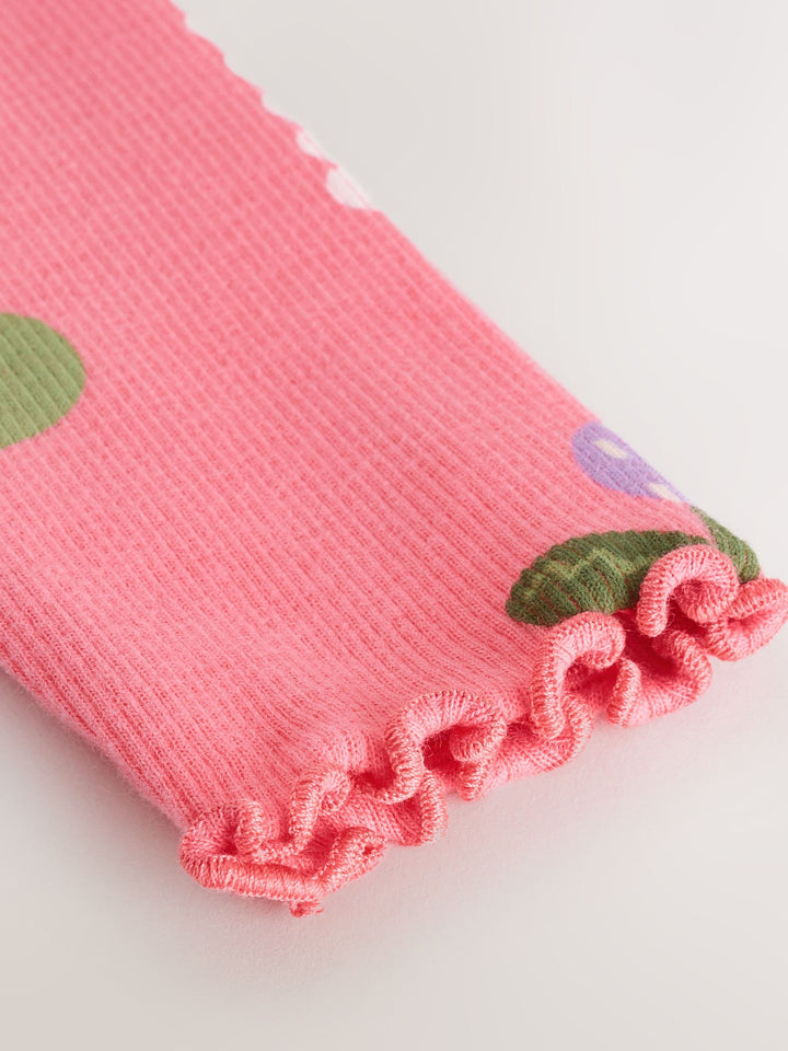 Add some fun to their everyday staples, with this long sleeve rib t-shirt, available in a selection of bright colours and prints, set against a cotton-rich base with added stretch. The t-shirt is finished with a ribbed crewneck collar and a ruffle trim the sleeve cuffs and hem. Cotton-rich blend Long sleeves Crewneck collar Ruffle trim Machine washable. 95% Cotton, 5% Elastane. Country of Origin: Bangladesh