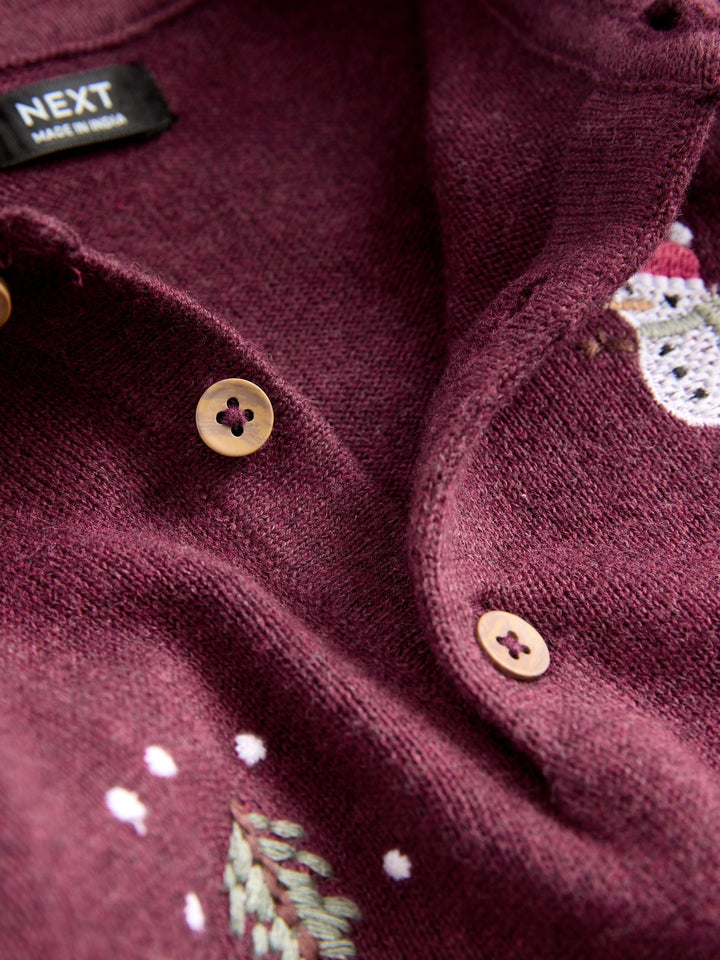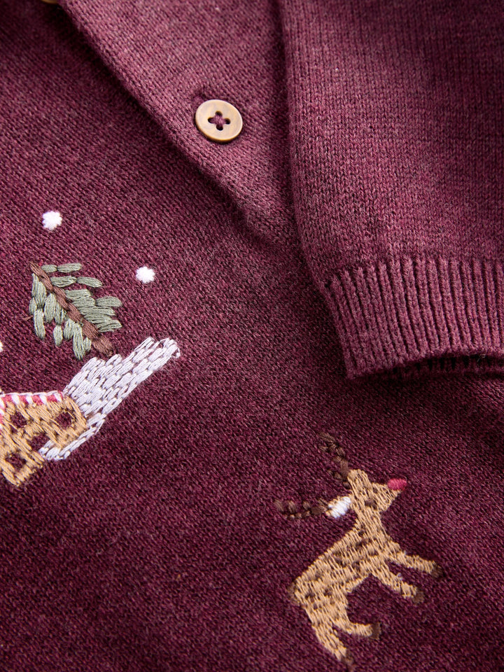 Plum Purple All Over Embroidered Knitted Christmas Polo Shirt (3mths-7yrs)