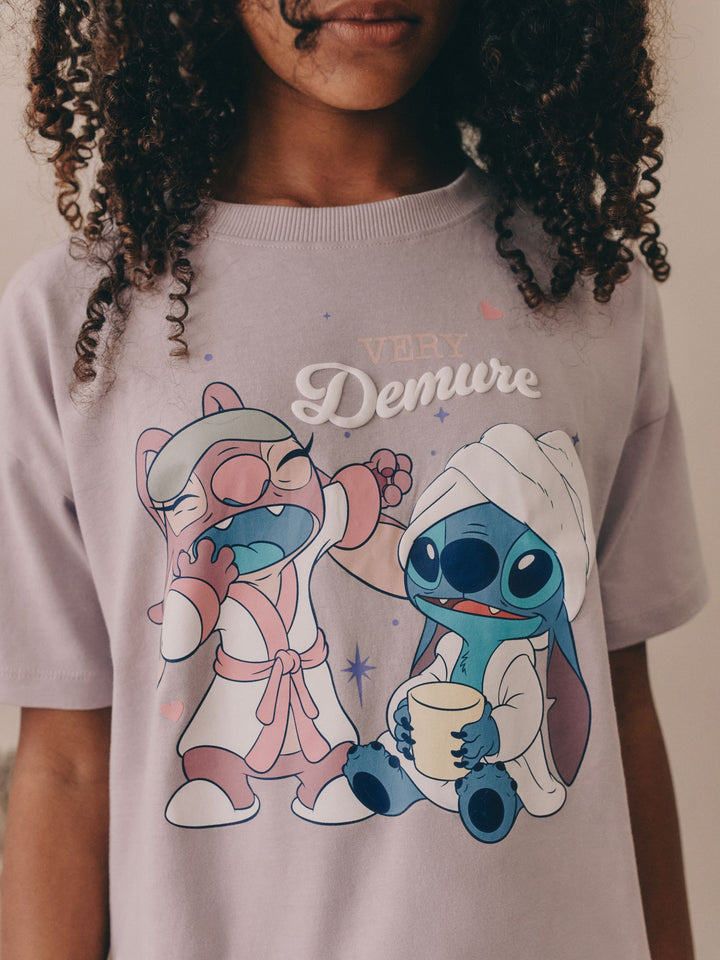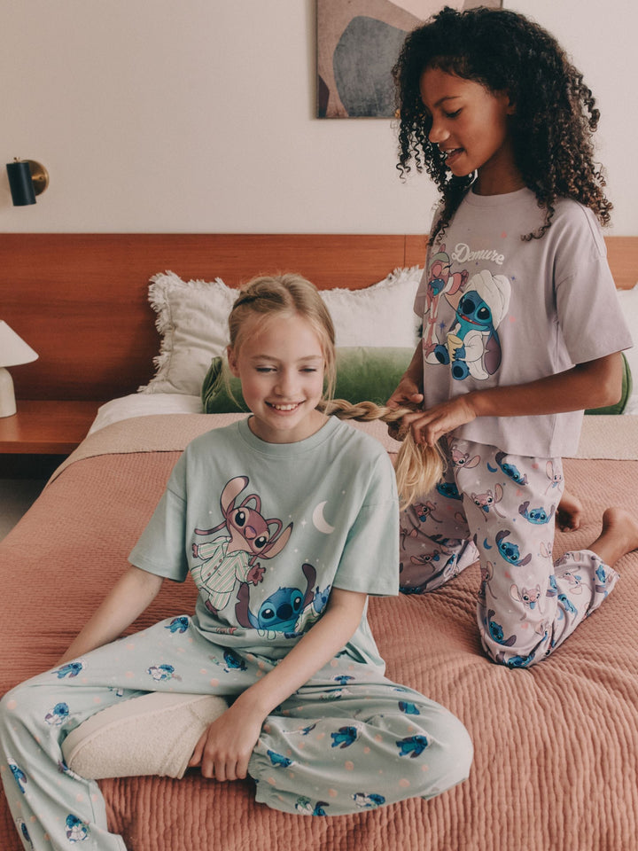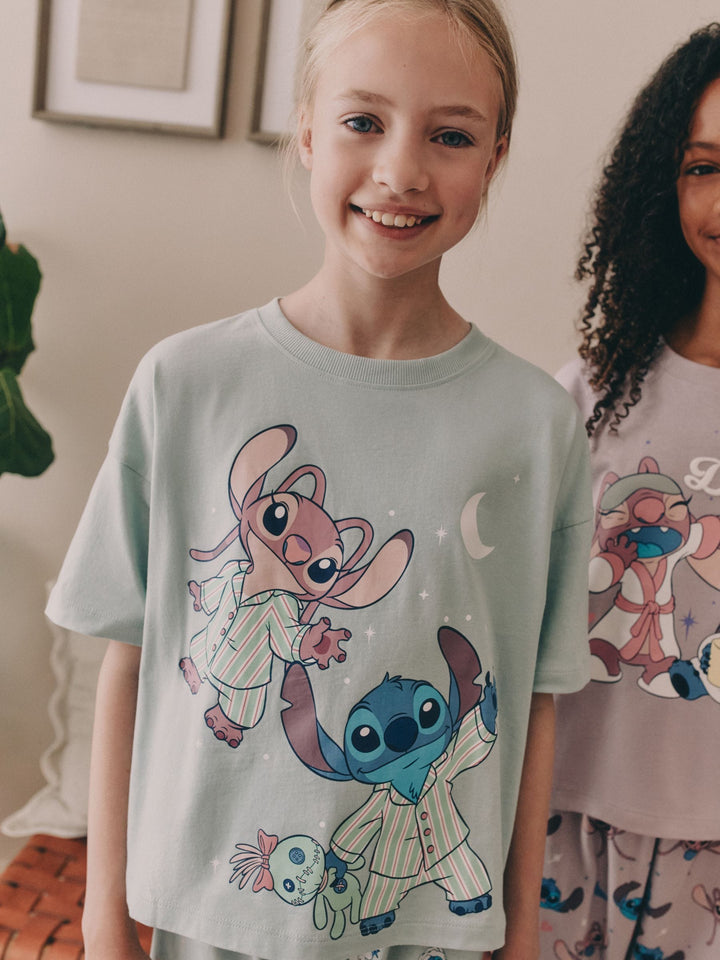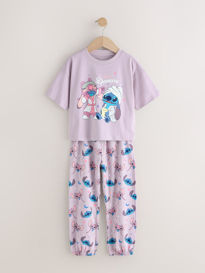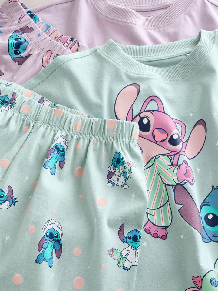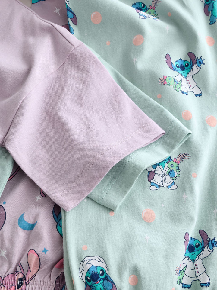 Prepare for a cosy night's sleep with this 2 pack of Lilo & Stitch pyjamas. This purple and green pack includes two sets, each with a comfortable short-sleeved top and matching joggers. With a fun Lilo & Stitch print on both sets and a playful puff print detail on the tops, these pyjamas are a must-have for any fan Lilo & Stitch print Puff print detail Short sleeves Matching joggers 2 pack Machine washable. 2 x Pyjama Top and 2 x Pyjama Bottom 100% Cotton. Country of Origin: Bangladesh Warning: Keep away from fire and flames.